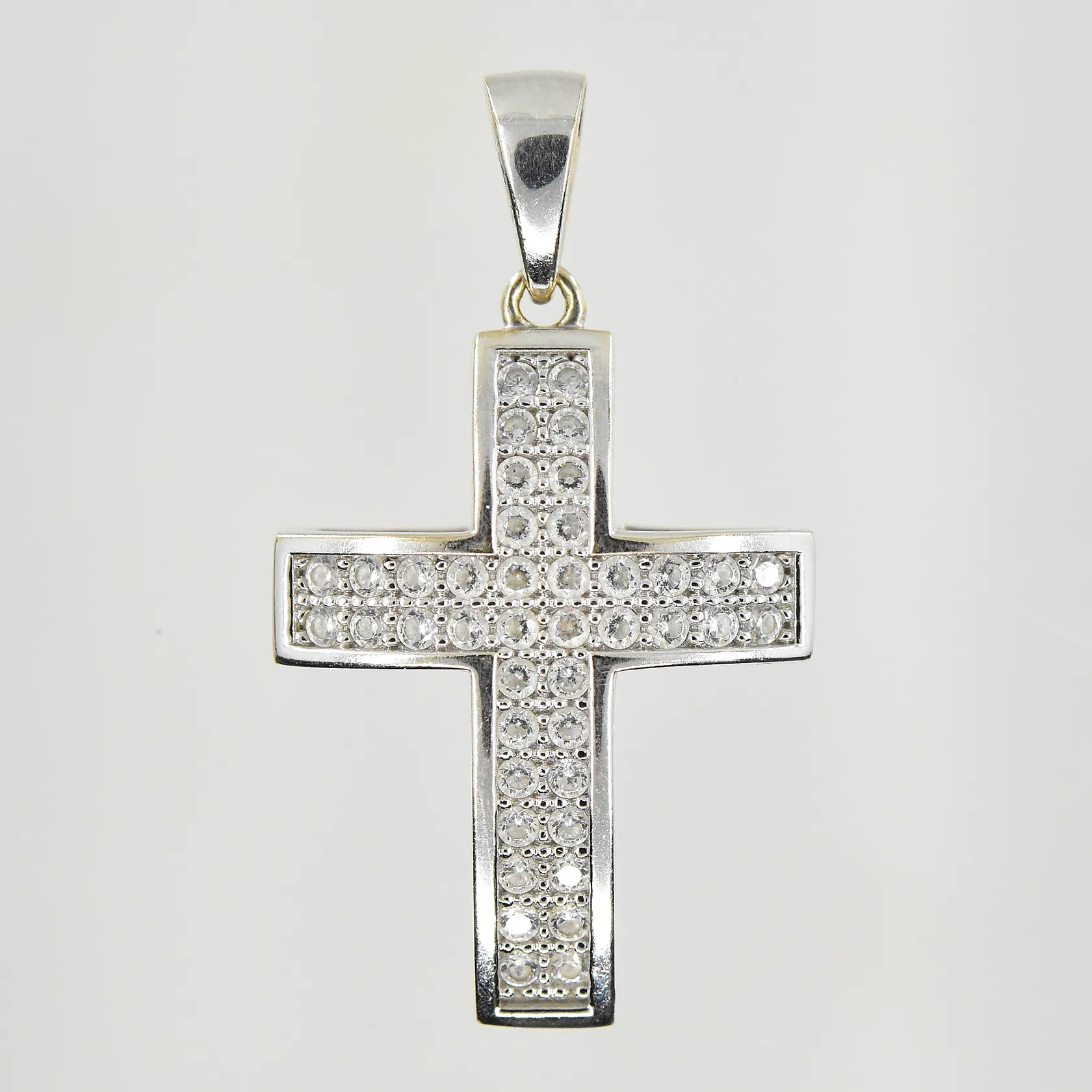 Hänge kors med vita stenar, längd 25 mm, bredd 16 mm, vitguld, 18K. Vikt: 3 g.
