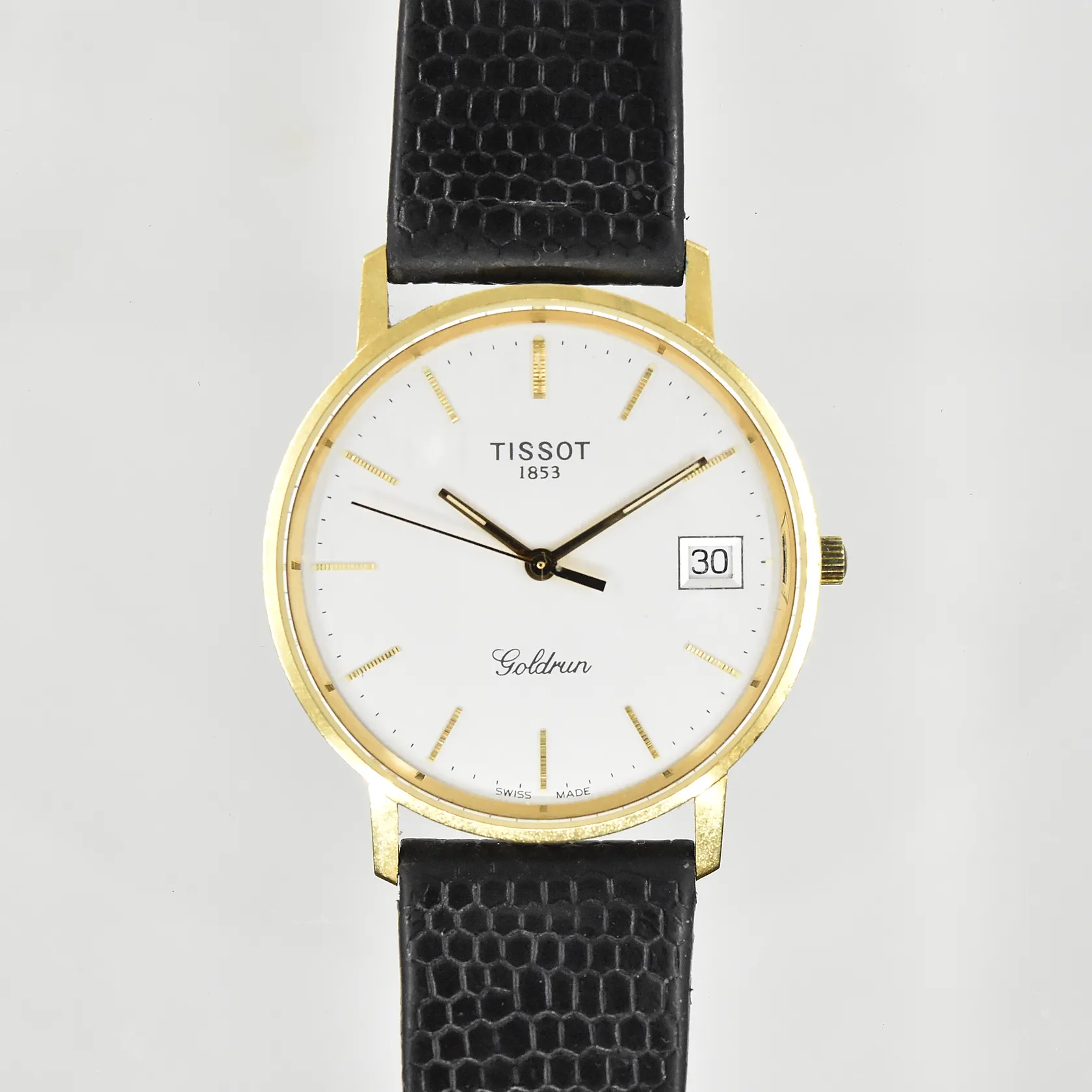 Herrur Tissot Goldrun 18K, boett Ø34 mm, quartz, datum, defekt läderband, graverad bakboett, behov av batteribyte, bruttovikt 28,6g.