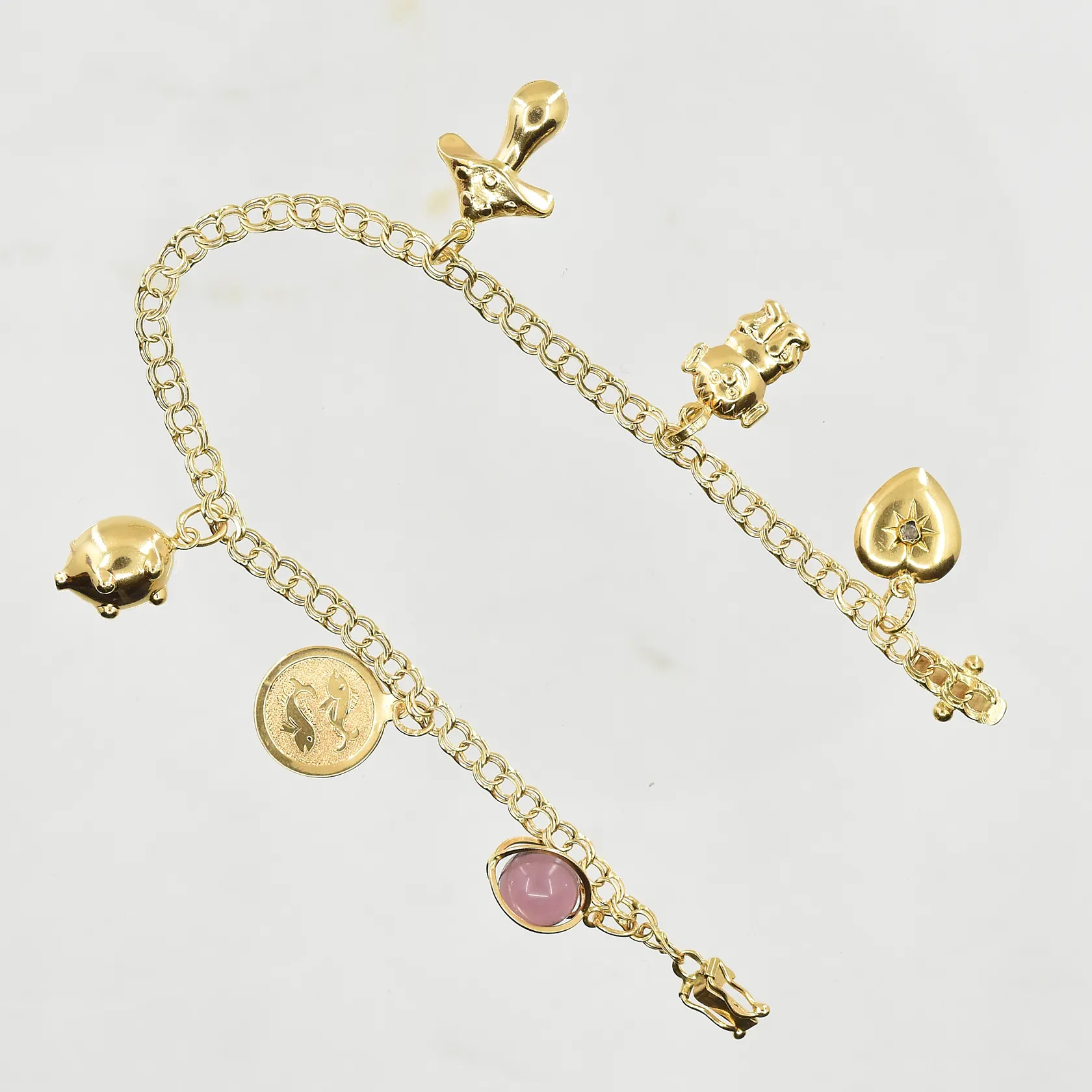 Armband Bismarck med 6 berlocker, längd 19 cm, länkens bredd 4 mm, 18K. Vikt: 8,5 g.