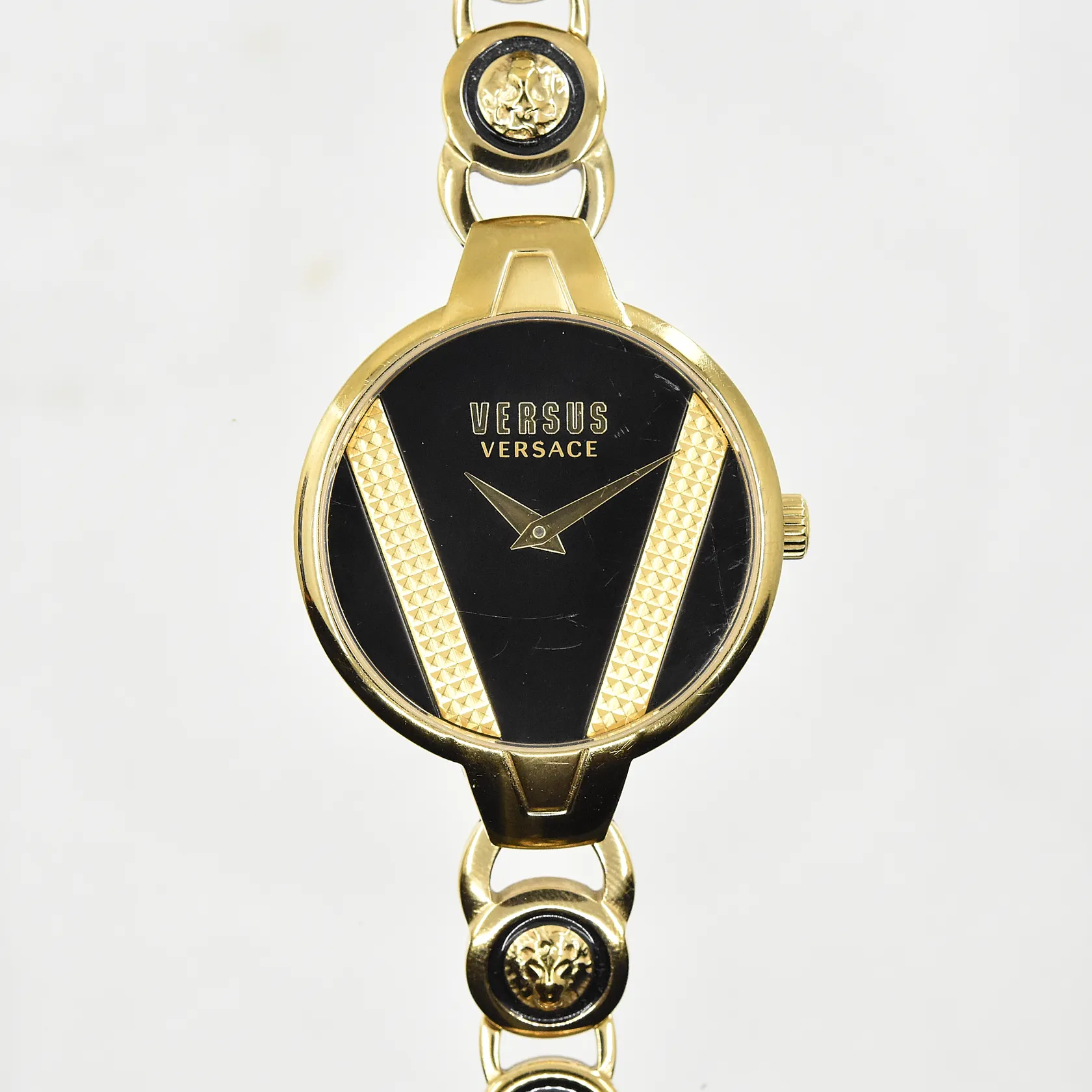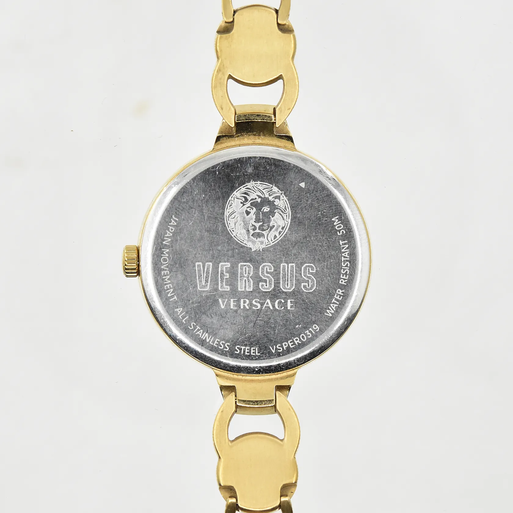 Damur Versus Versace, boett Ø36 mm, quartz, guldtonat stål, refnr vsper 0319, behov av batteribyte, cert ej ifyllt, sliten box, ( kudde saknas).