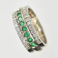 Ring med diamanter ca 0,15ctv och smaragder, stl 16, bredd 7 mm, gravyr, vitguld, 18K. Vikt: 8,3 g.