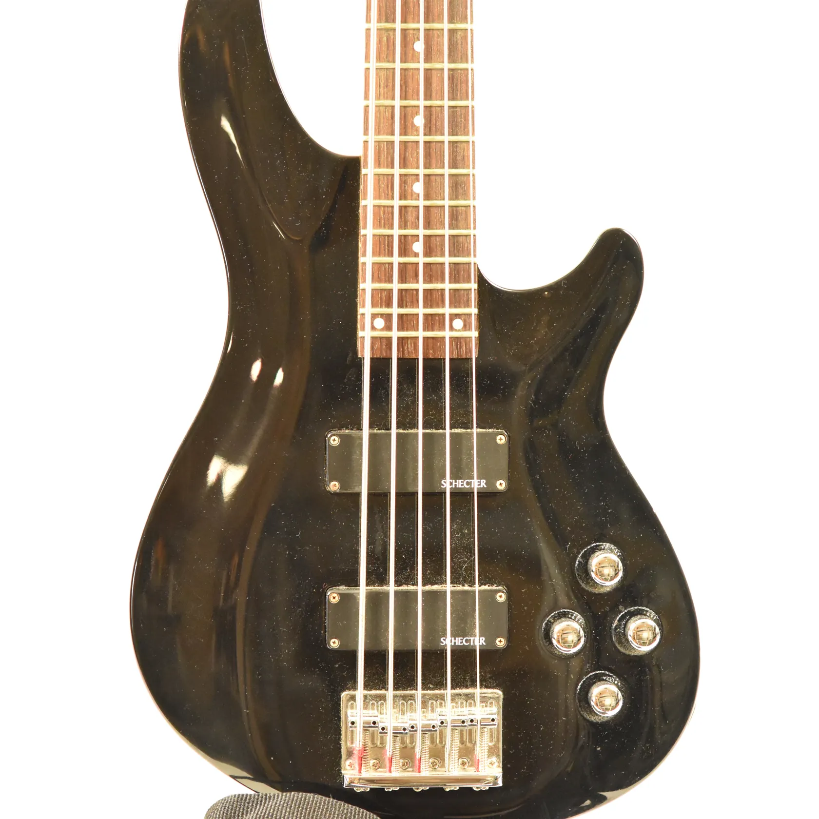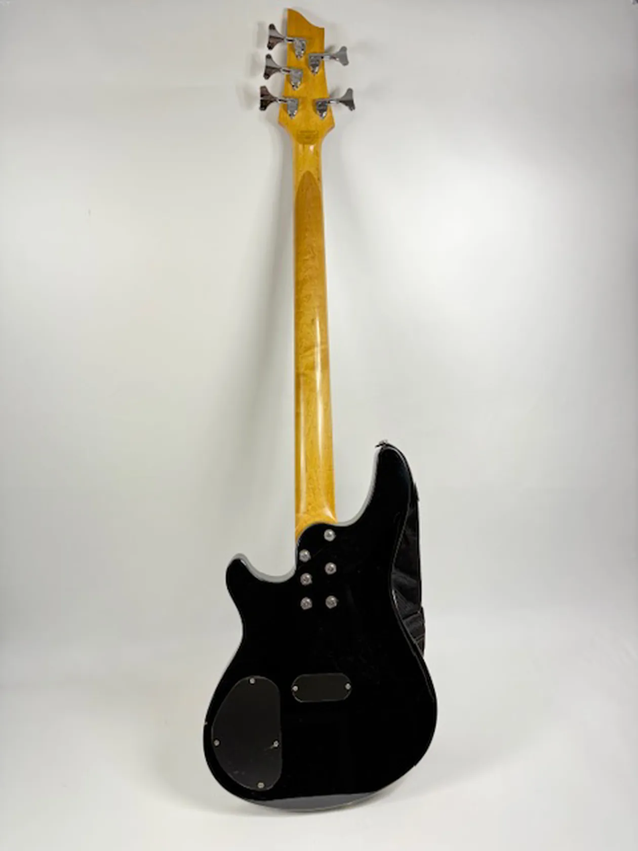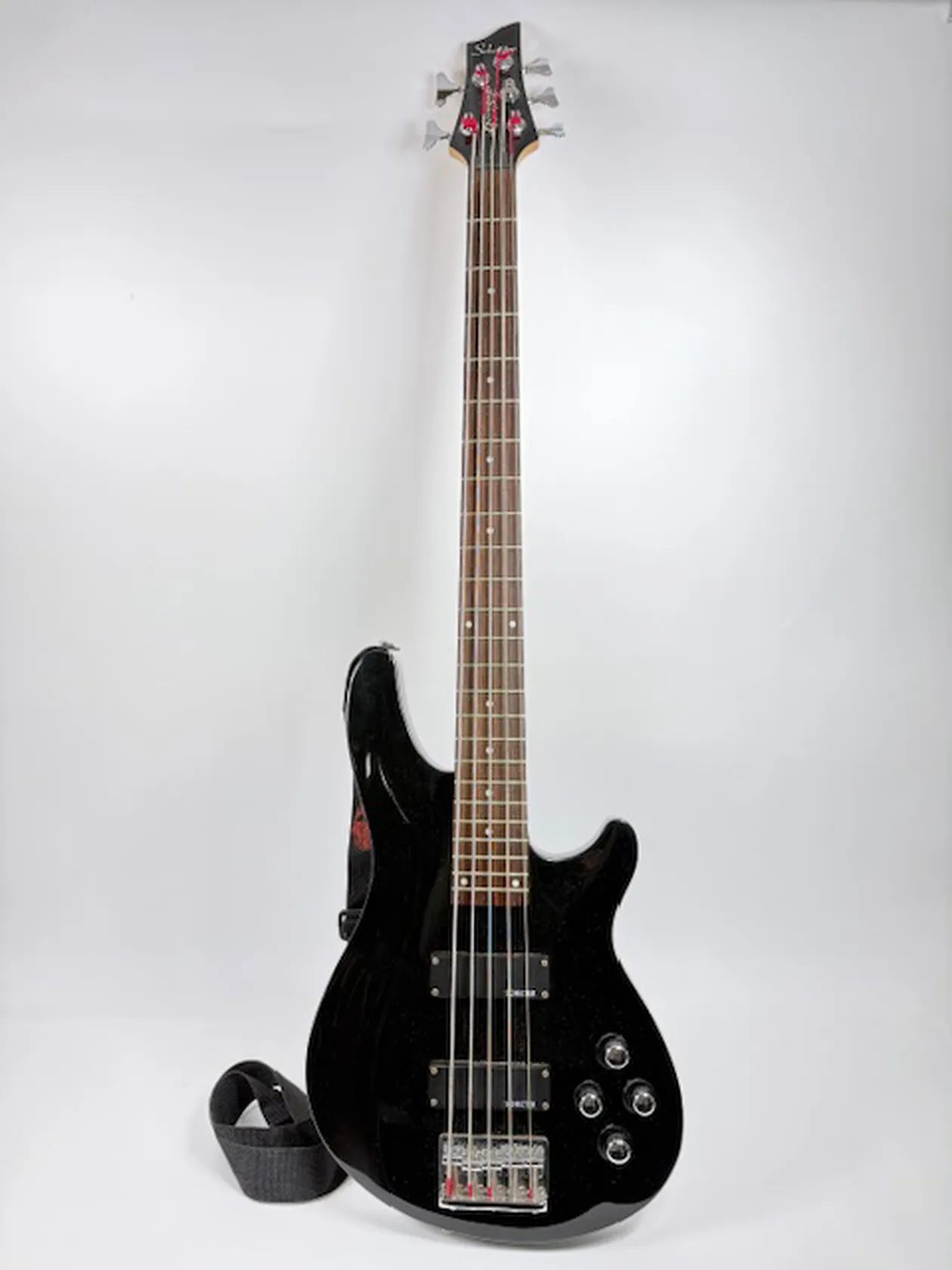 Elbas, Schecter Omen-5 diamond series, serienr 0638807, kropp i gloss black, hals i lönnfärg med vita inlägg, mjukt fodral. Skickas med postpaket.