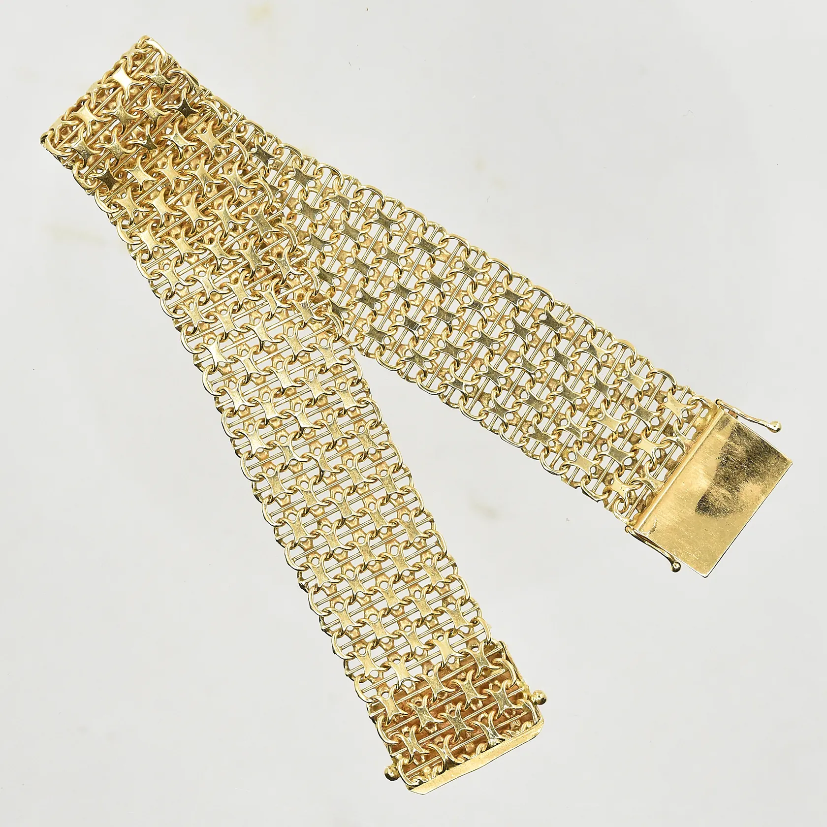 Armband X-länk med stav, längd 19½ cm, bredd 18 mm, 18K. Vikt: 31,8 g.