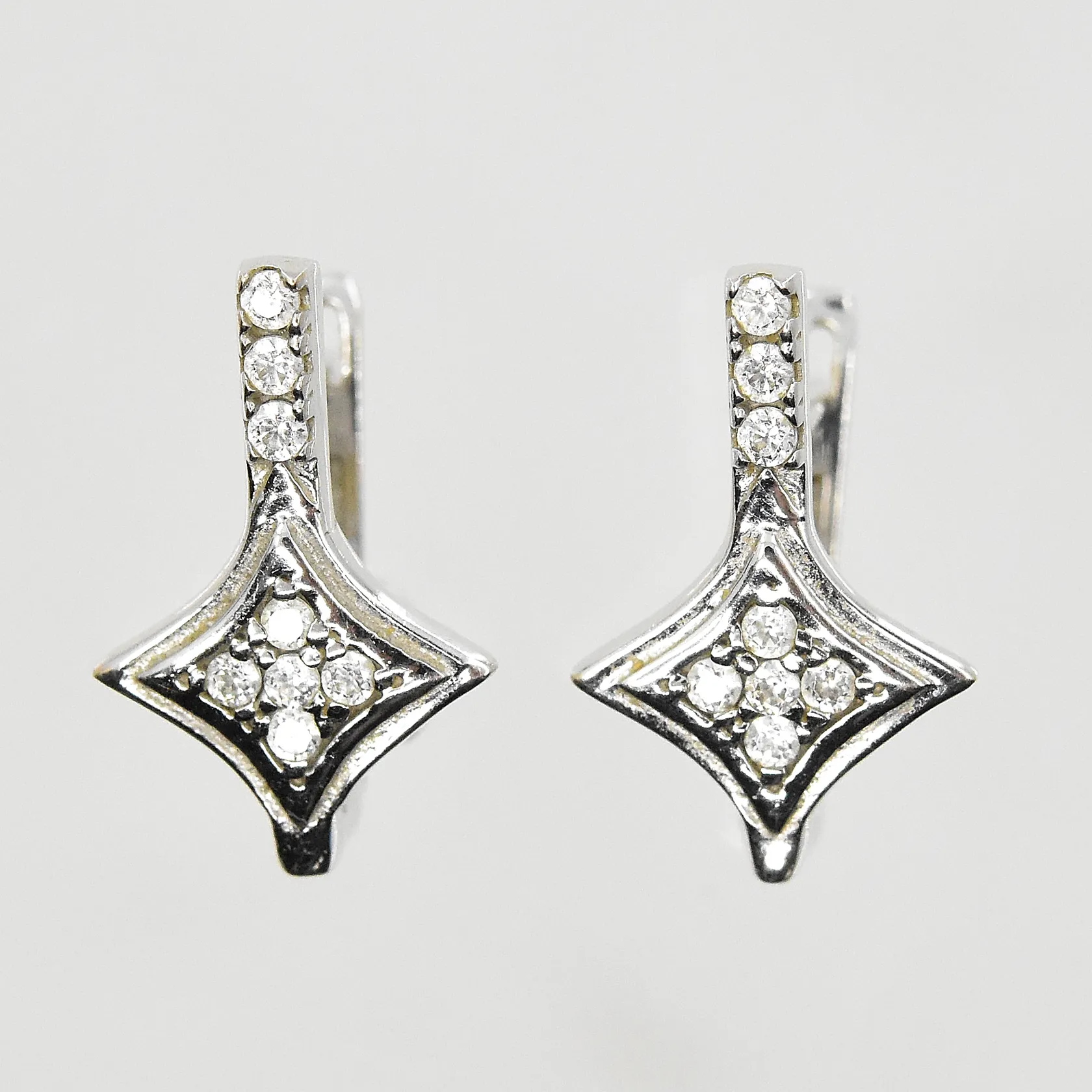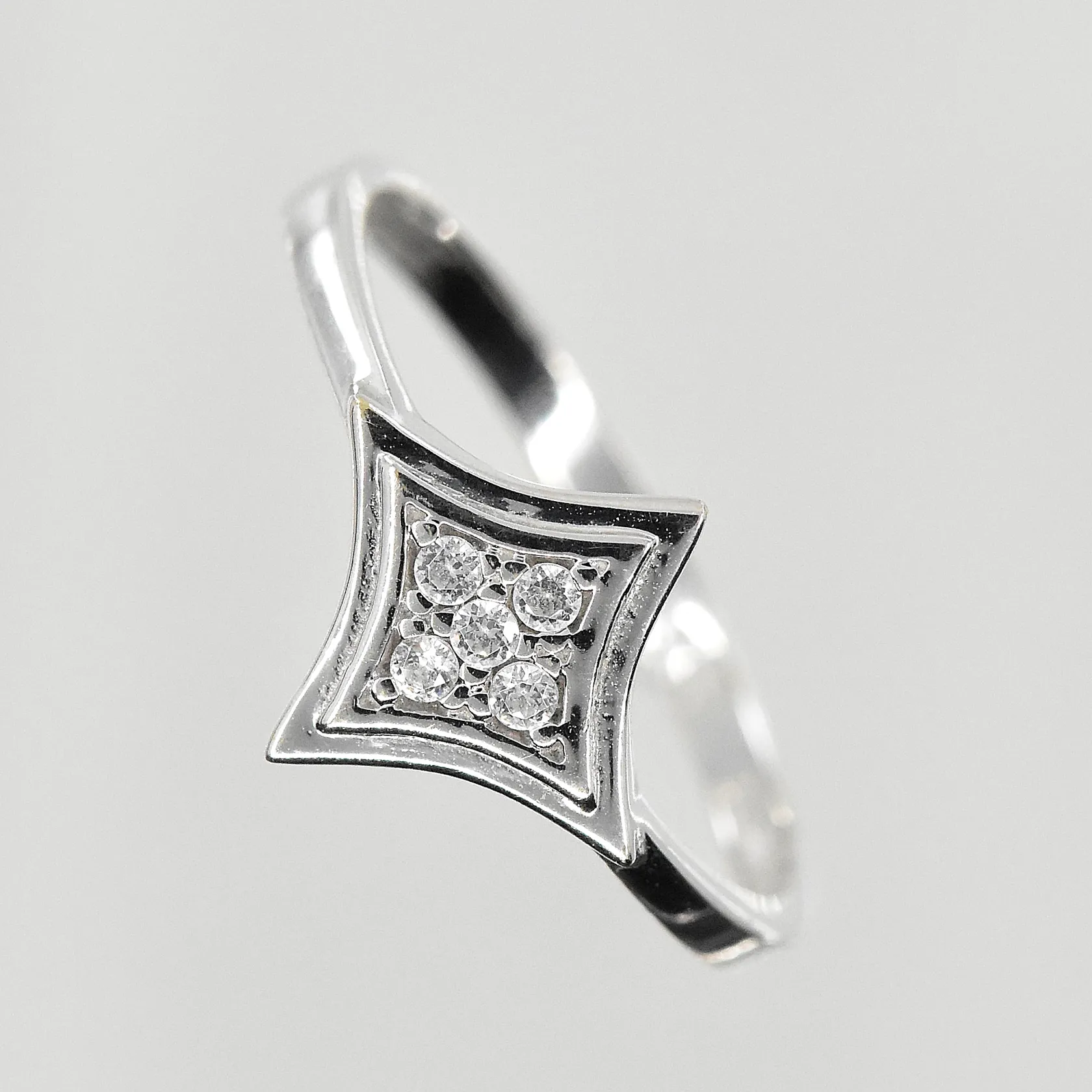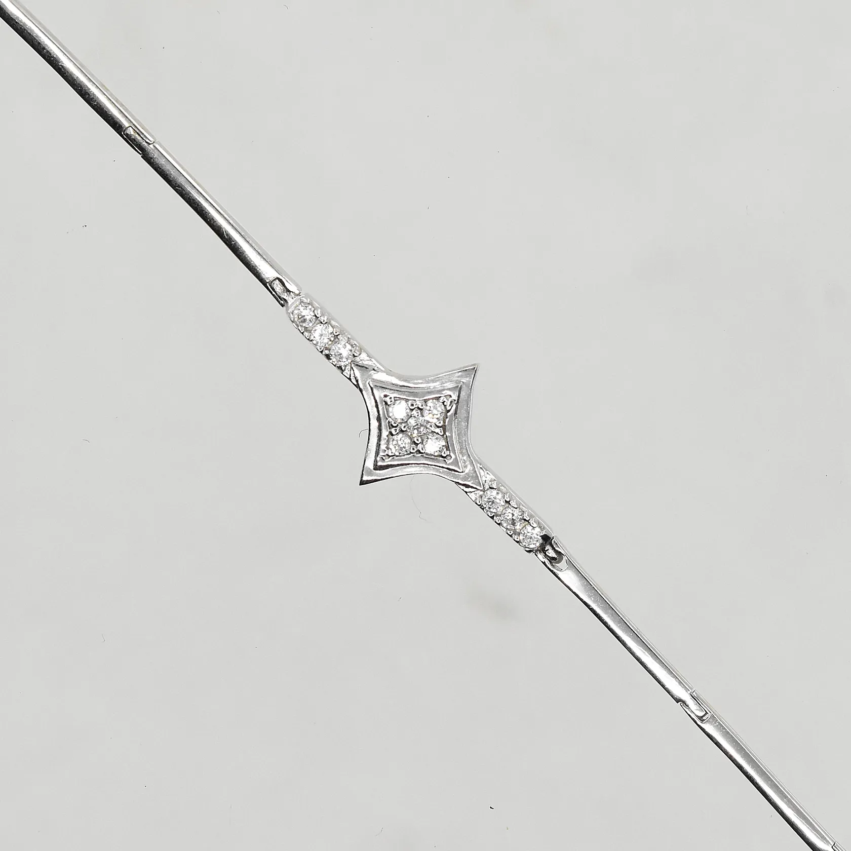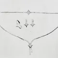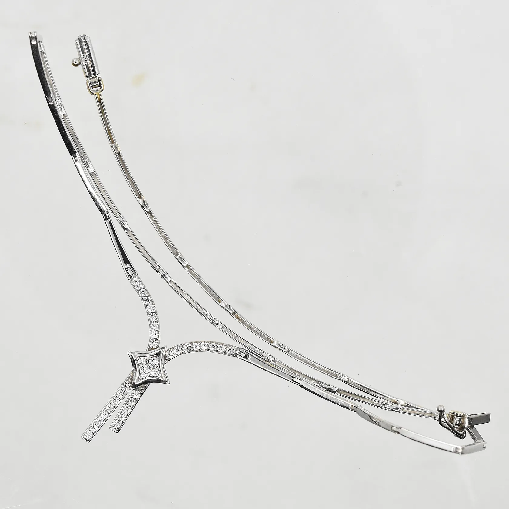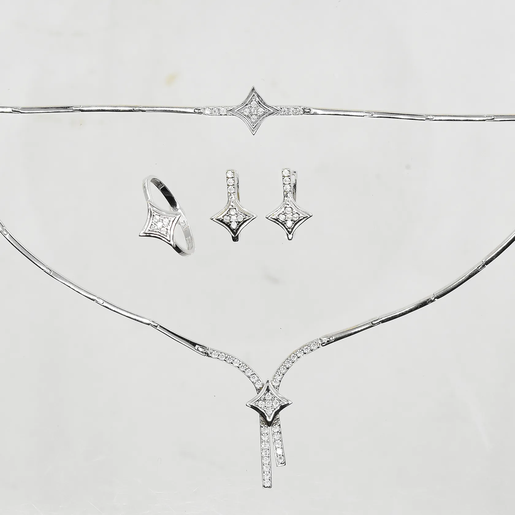 Set med vita stenar, collier, halvstel modell, längd ca 42 cm, 1 armband längd ca 16½ cm, 1 ring stl 17¼, 1 par örhängen längd 16 mm, vitguld, 18K. Vikt: 22,7 g.