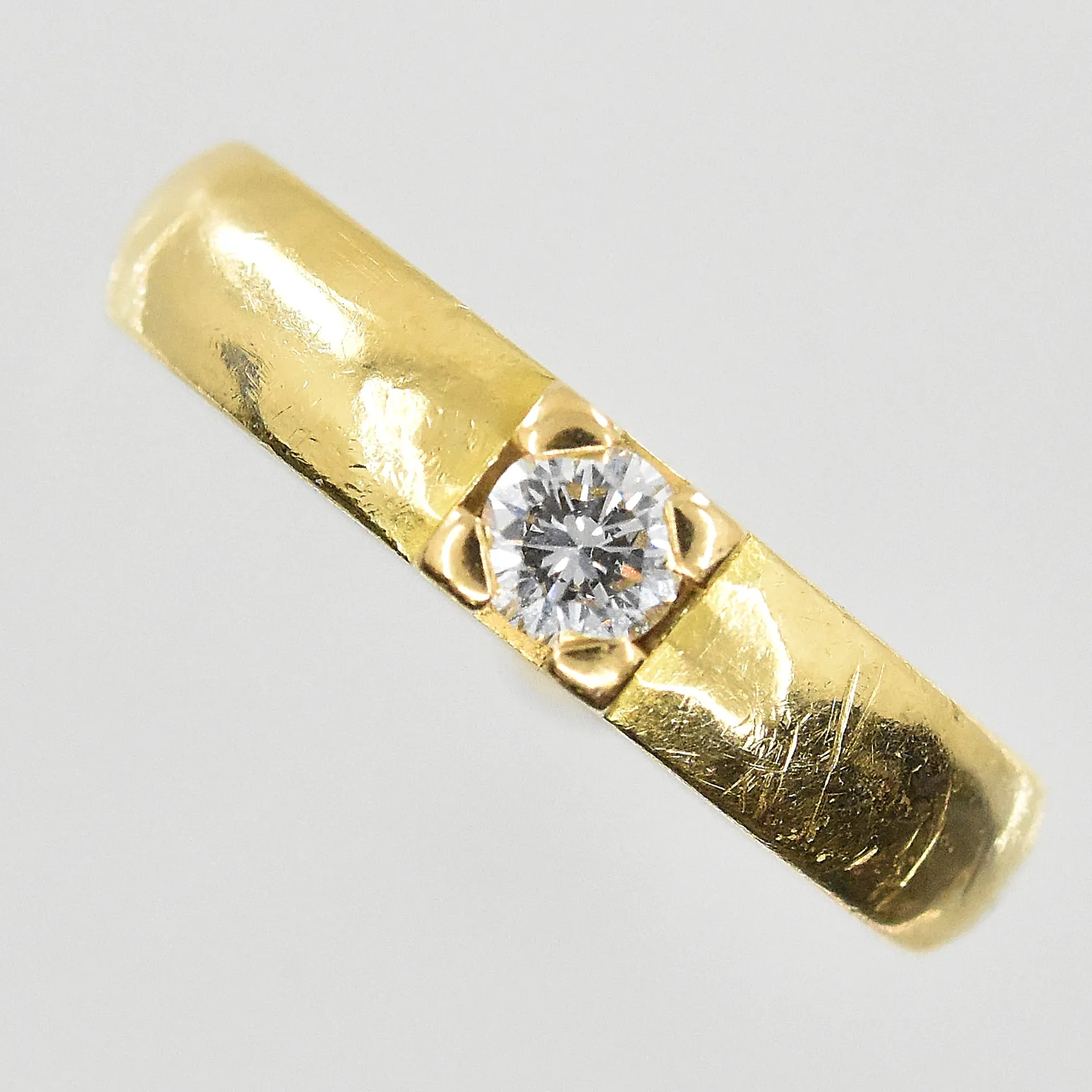 Ring med diamant 0,20ct, stl 17½, bredd 4 mm, gravyr, 18K. Vikt: 6,2 g.