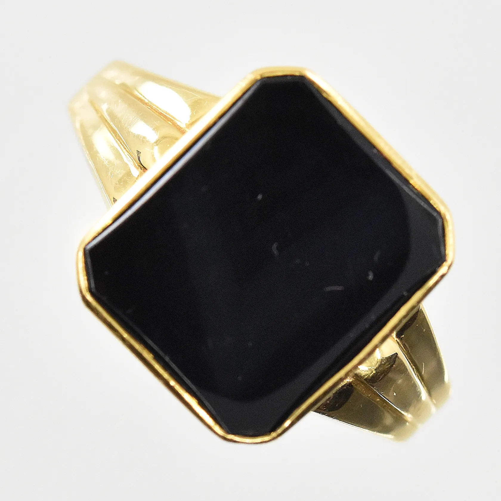 Klackring med Onyxplatta, stl 19½, bredd 3-14 mm, gravyr, 18K. Vikt: 3,9 g.