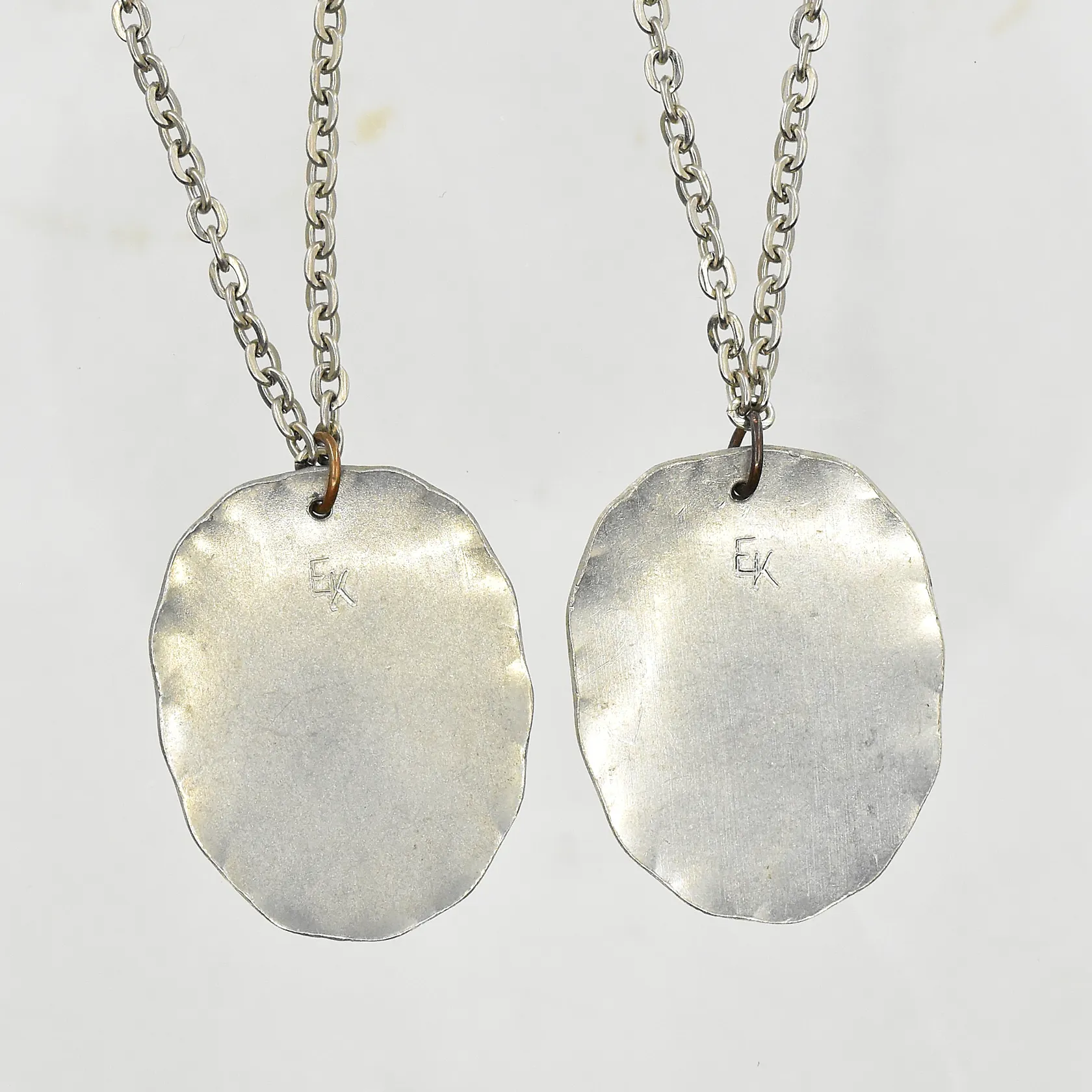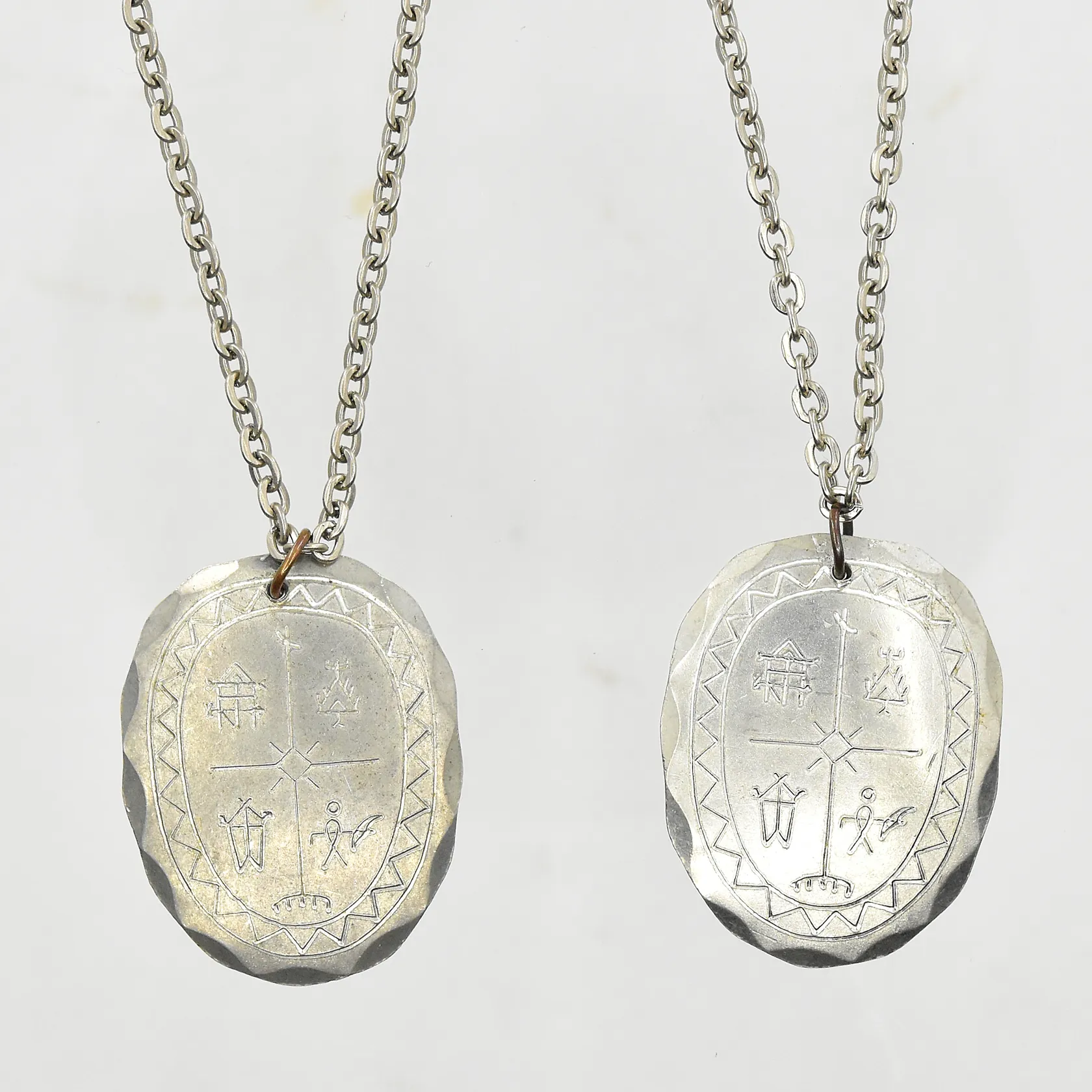 2 hängen i tenn, Sameslöjd, stämplade EK, 2 kedjor i metall, längd ca 66 cm.