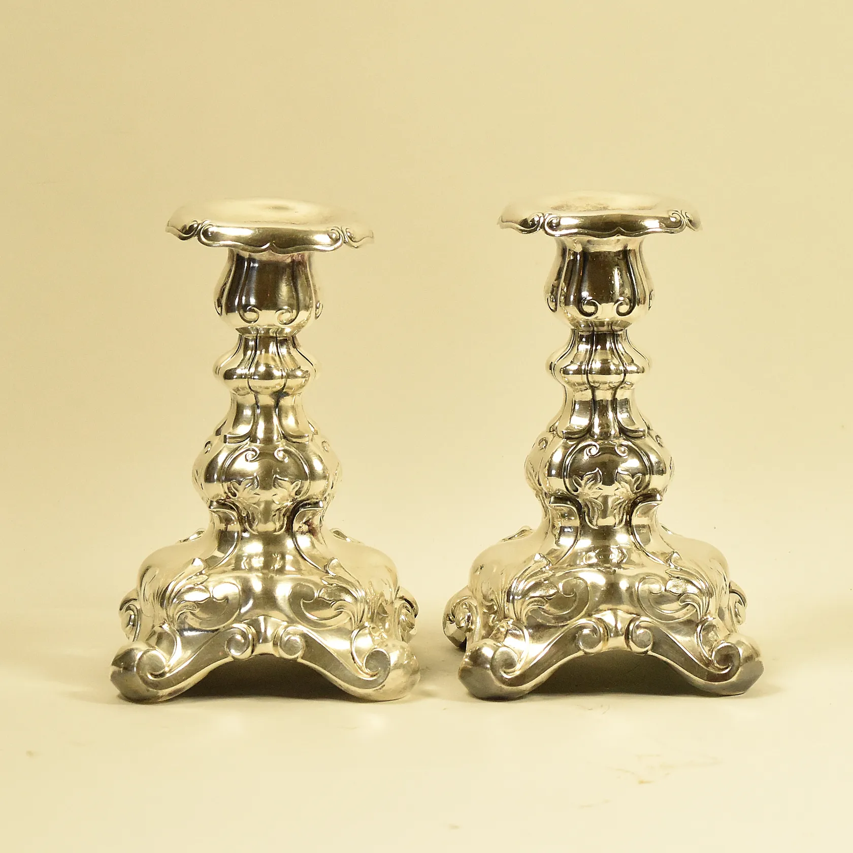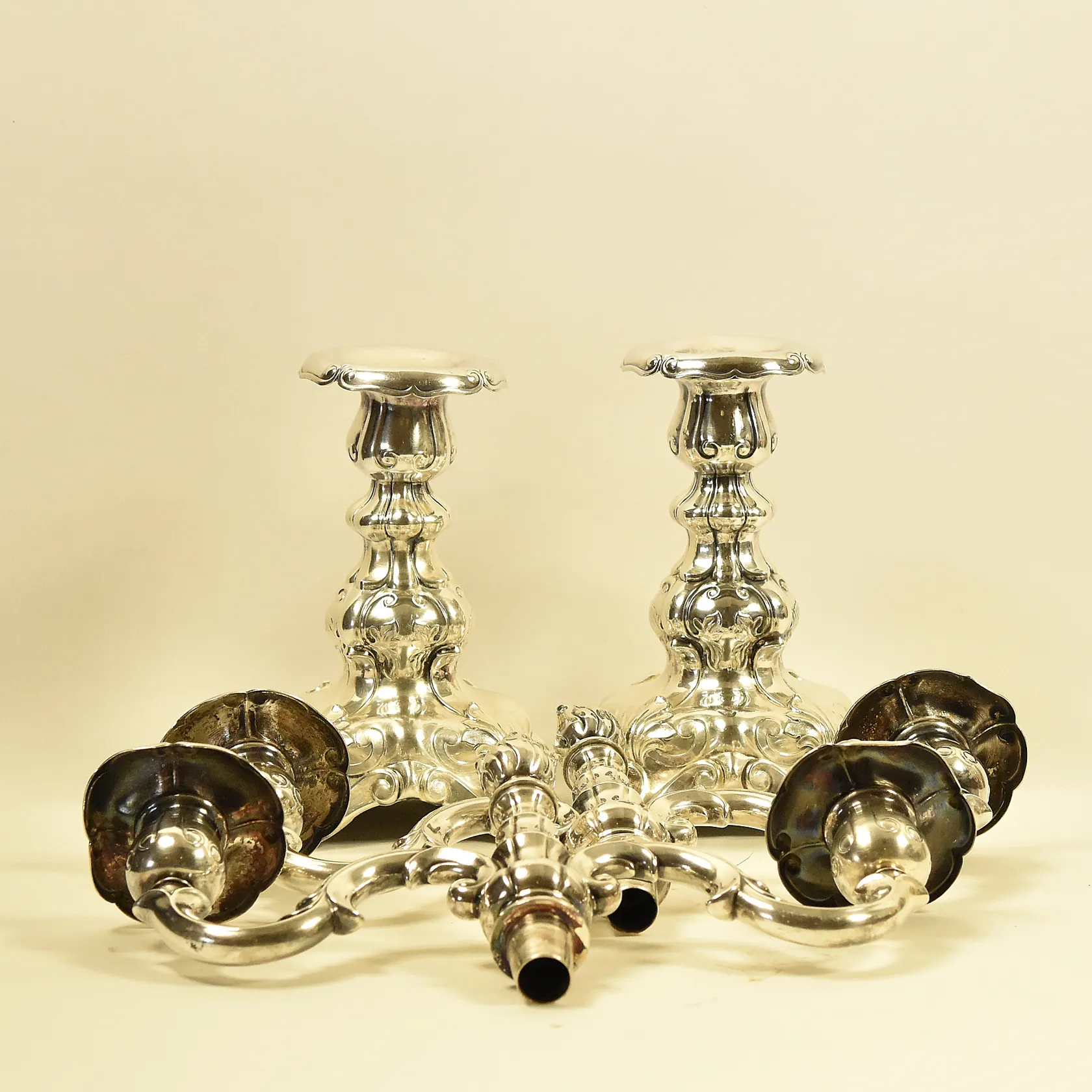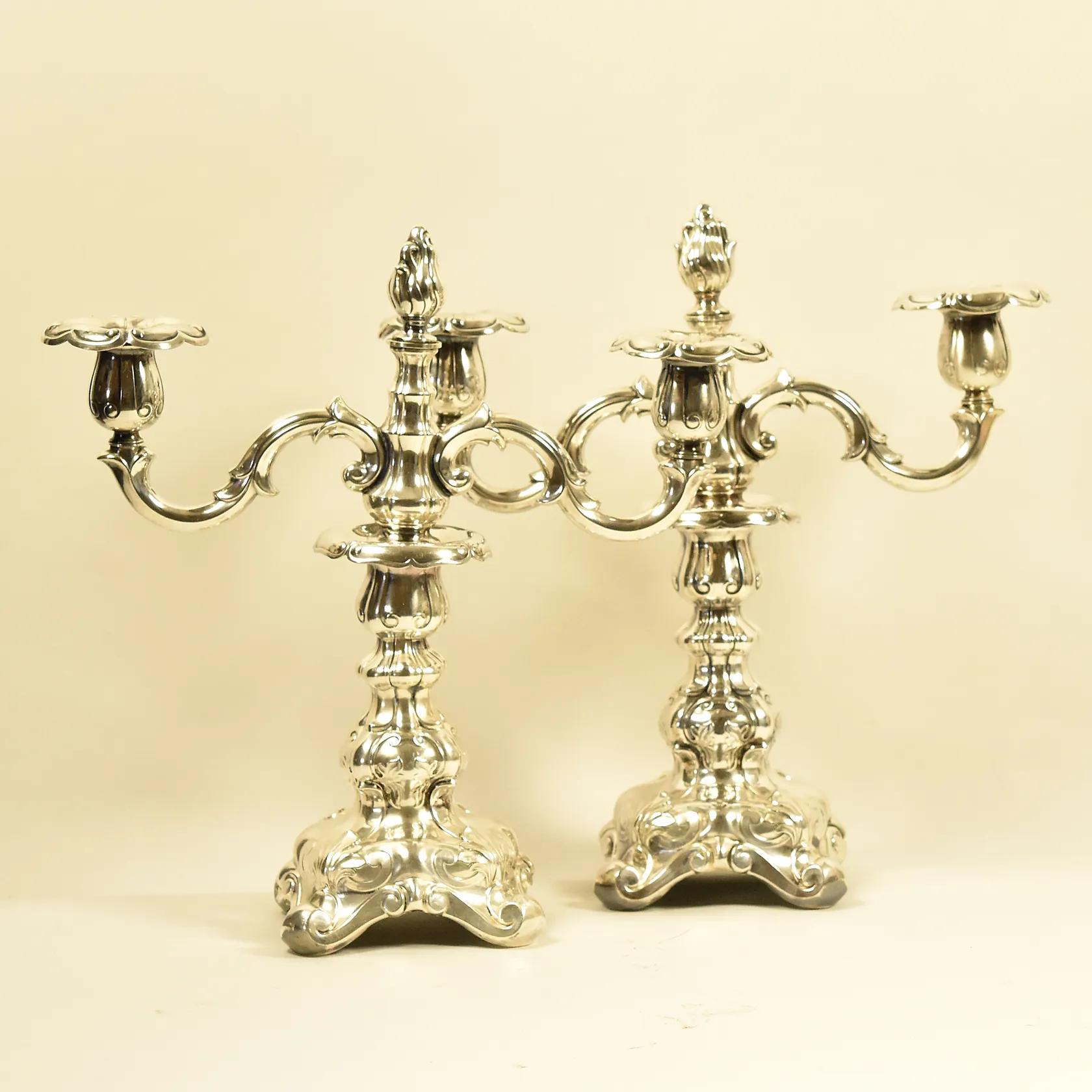 Ett par kandelabrar/ljusstakar, Rokoko stil, avtagbara ljushållare, höjd ca 32 cm, bredd ca 31 cm, en ljushållare är krökt, GAB nysilver. Skickas med postpaket.