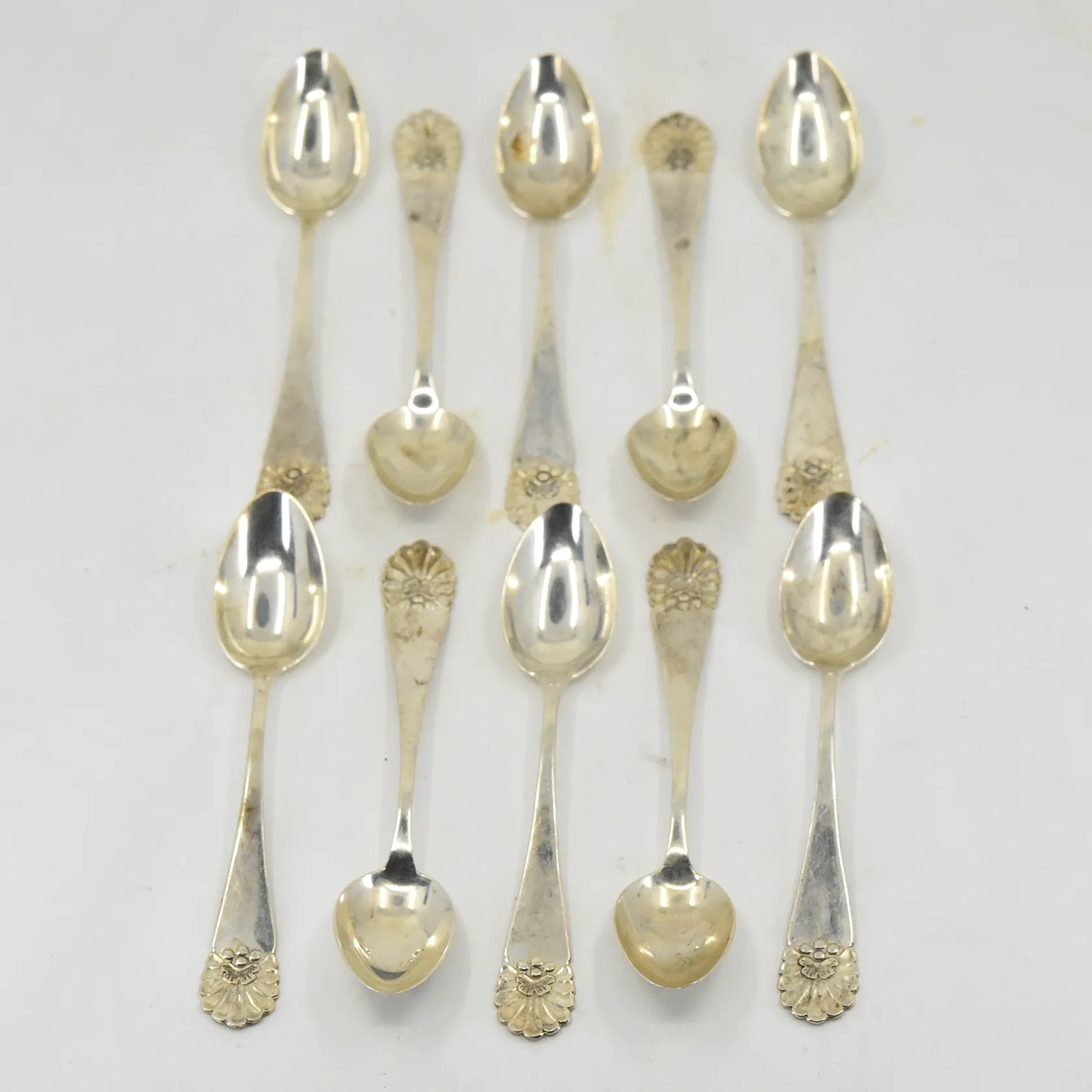 10 teskedar, längd 10 cm, MGAB, tillverkade ca 1930-1940-tal, silver. Vikt: 79,5 g.