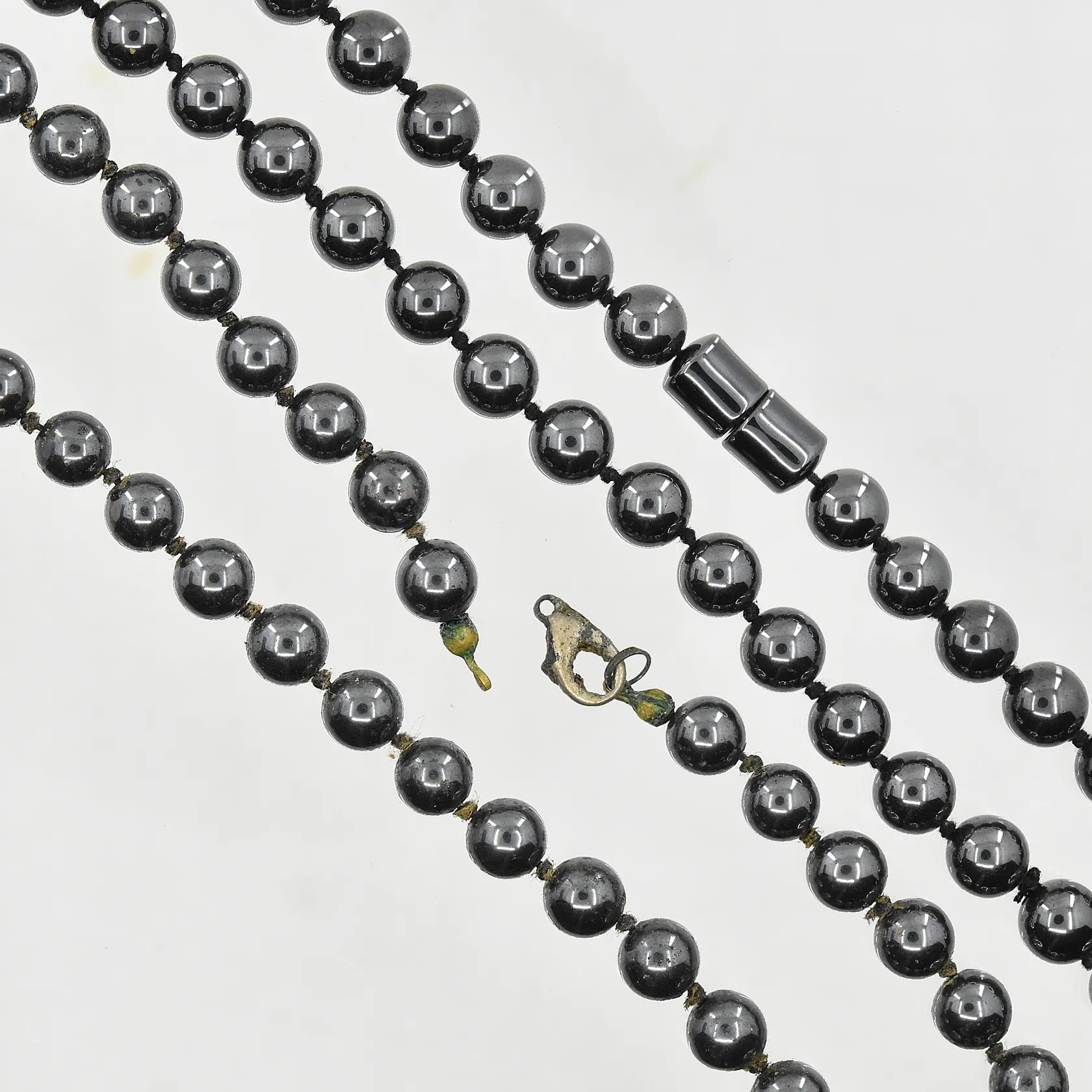 2 collier med hematiter, längd 46-59 cm, Ø7 mm, en ögla vid lås saknas.