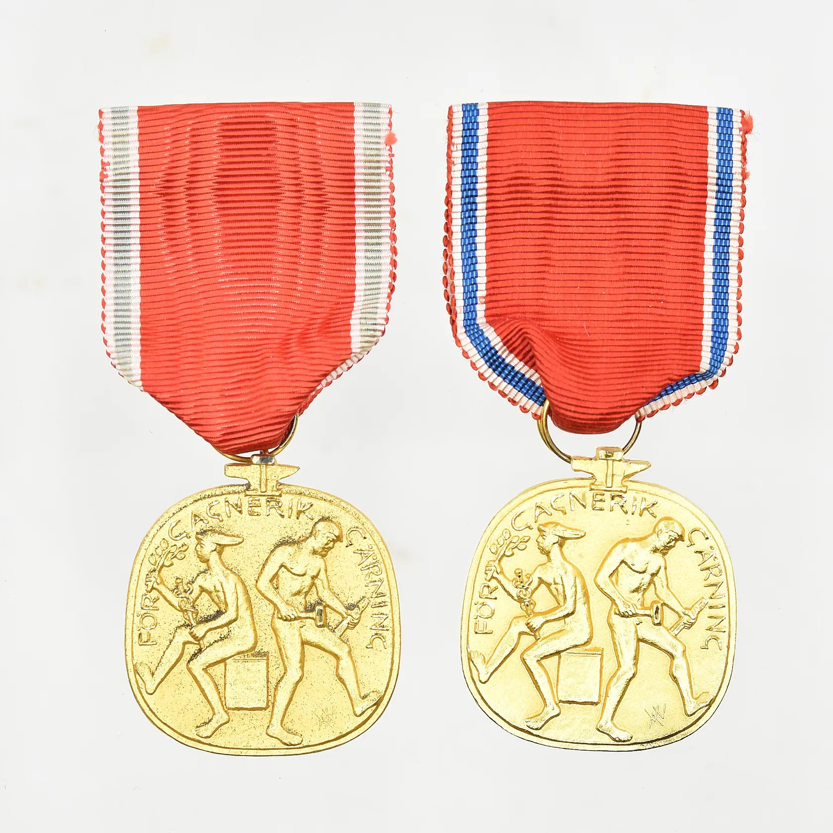 2 Medaljer, För Gagnerik Gärning, längd 36 mm, bredd 32 mm, 1970-1975, personlig gravyr baksida, förgyllt silver. bruttovikt 47,5g Vikt: 47,5 g.