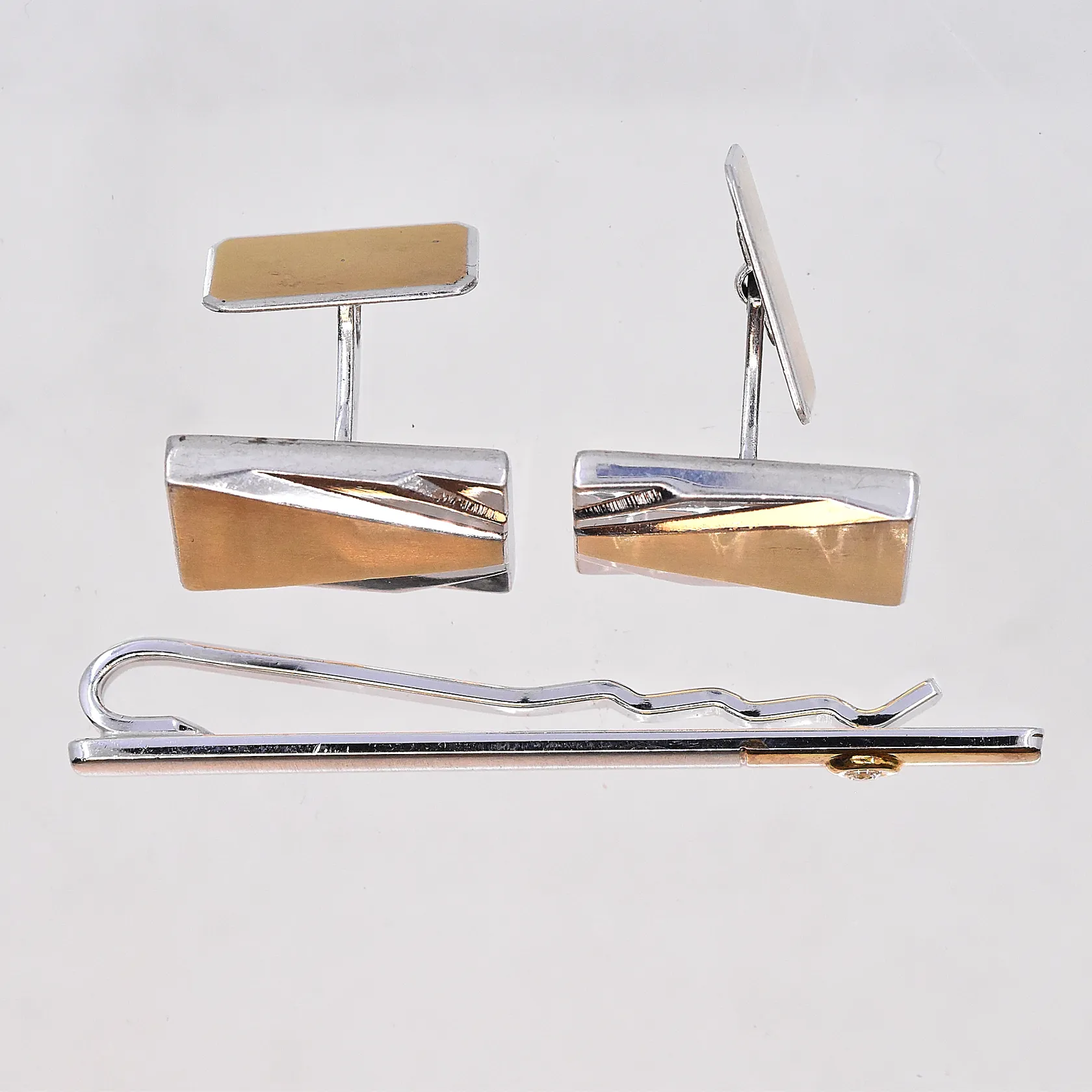 Ett par manschettknappar och en slipsnål, längd på slipsnålen 61 mm och bredd 6 mm, stl på manschettknapparna 21x13 mm, detaljer i förgyllt silver, silver 830/1000. Vikt: 20,6 g.