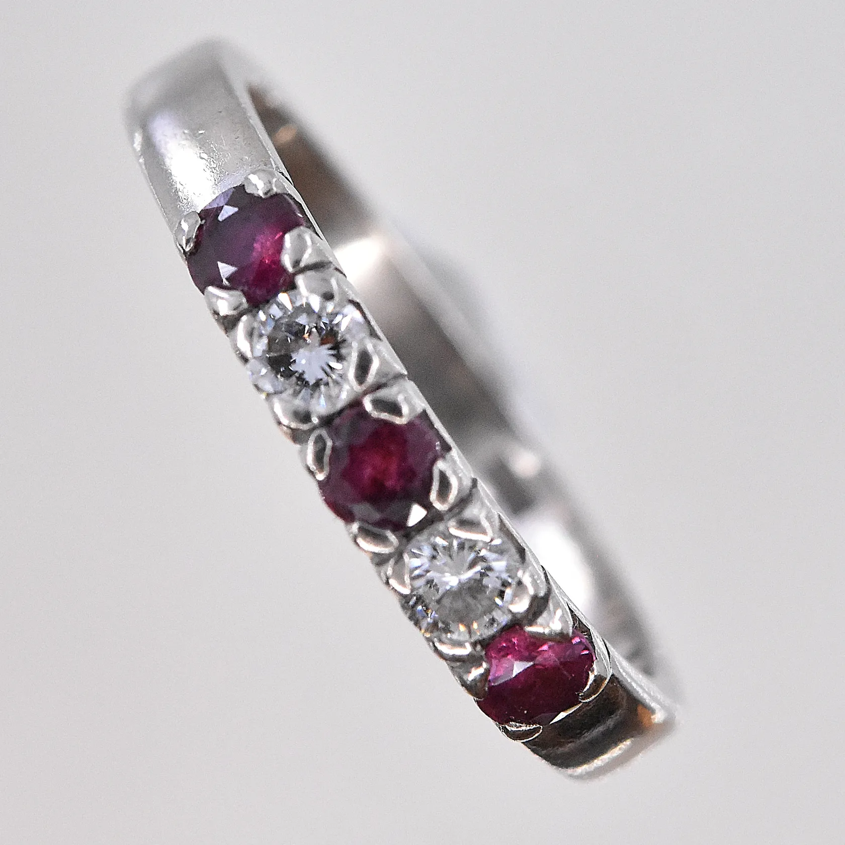 Ring med diamanter 2x0,14ct och röda stenar, stl 19, bredd 3 mm, vitguld,18K. Vikt: 5,3 g.