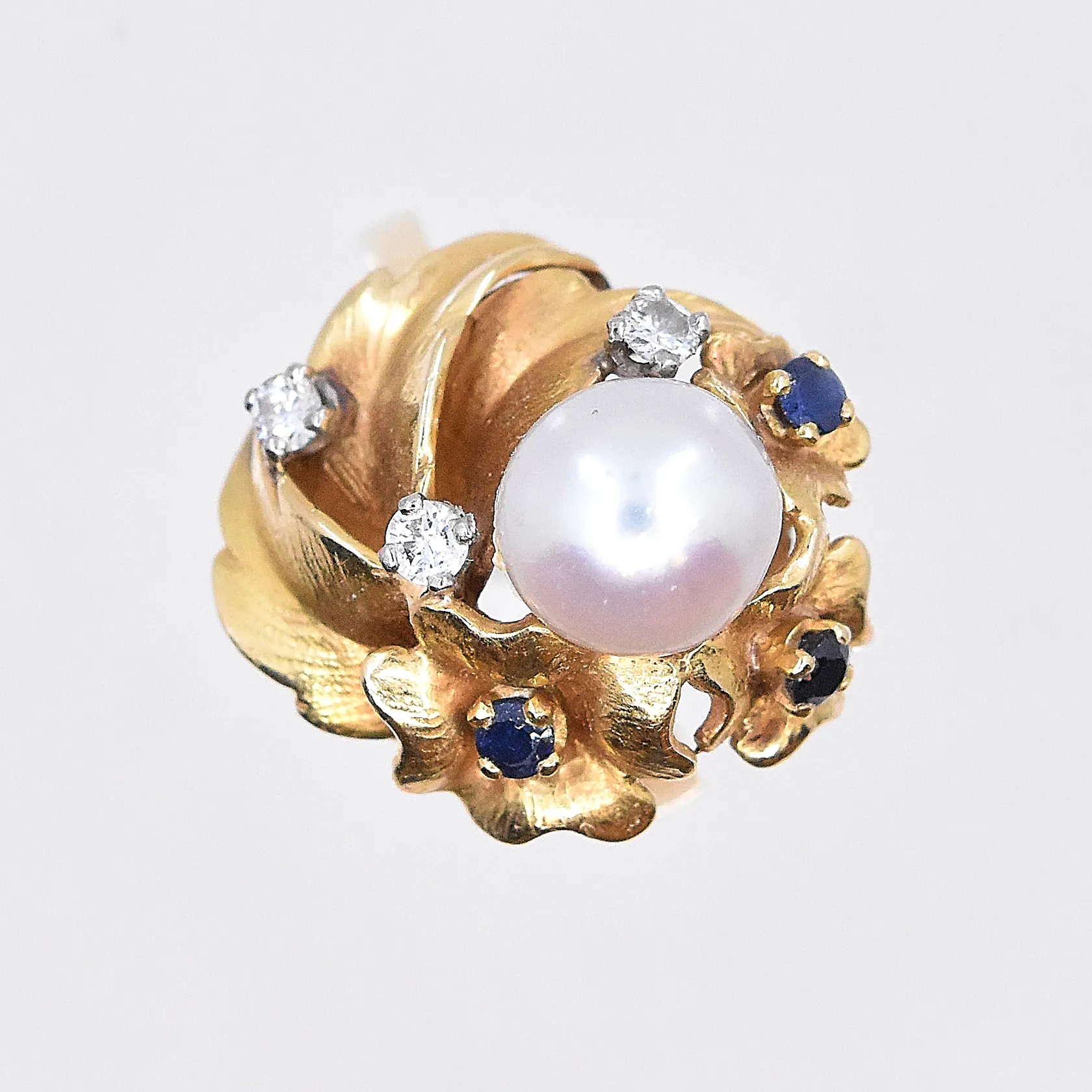 Ring med diamanter 3x0,05ct, pärla och blå stenar, stl 17¼, bredd skena 2 mm, 18K. Vikt: 8 g.