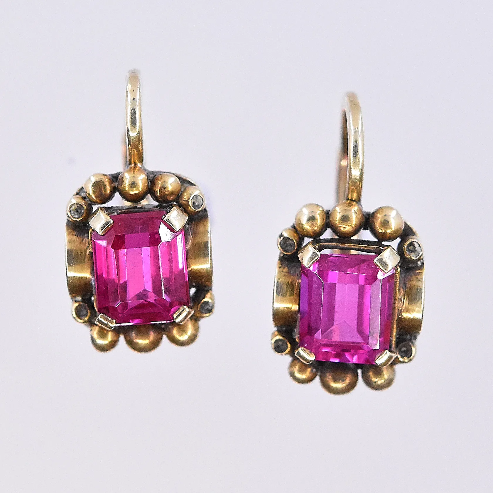 Ett par örhängen med cerise stenar, längd 15 mm, bredd 8 mm, 14K. Vikt: 2,7 g.