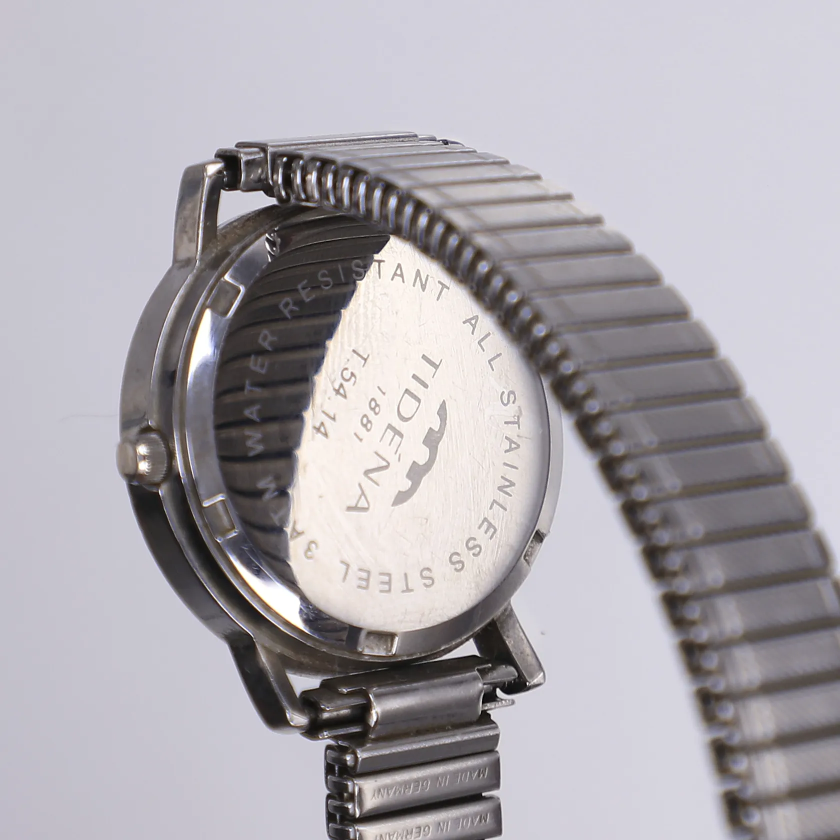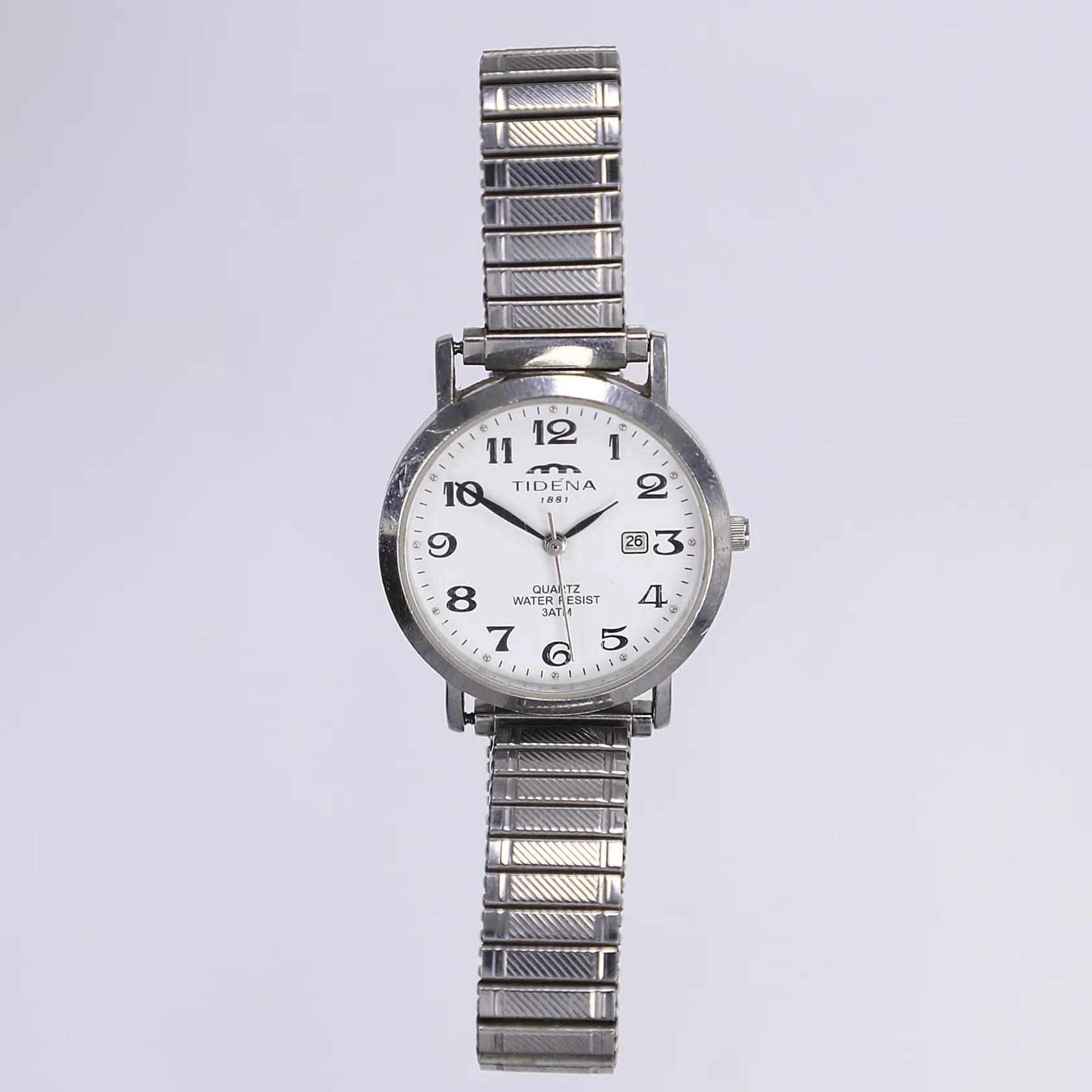 Damur Tidena, Ø30mm, stål, quartz, datum, flexlänk i stål, repig boett samt glas, går ej troligen batteribyte