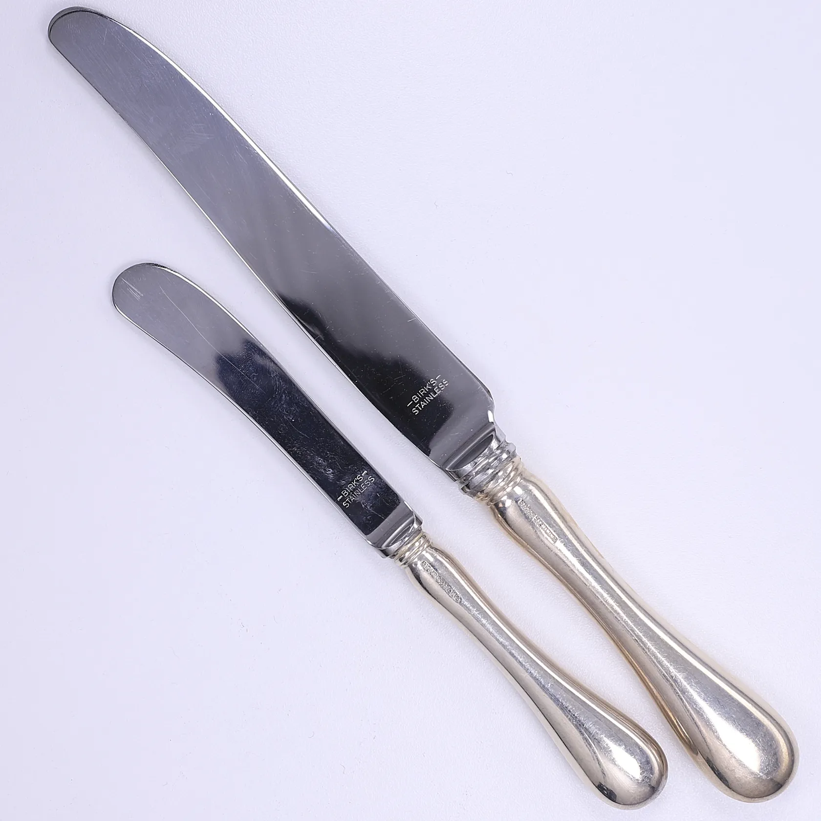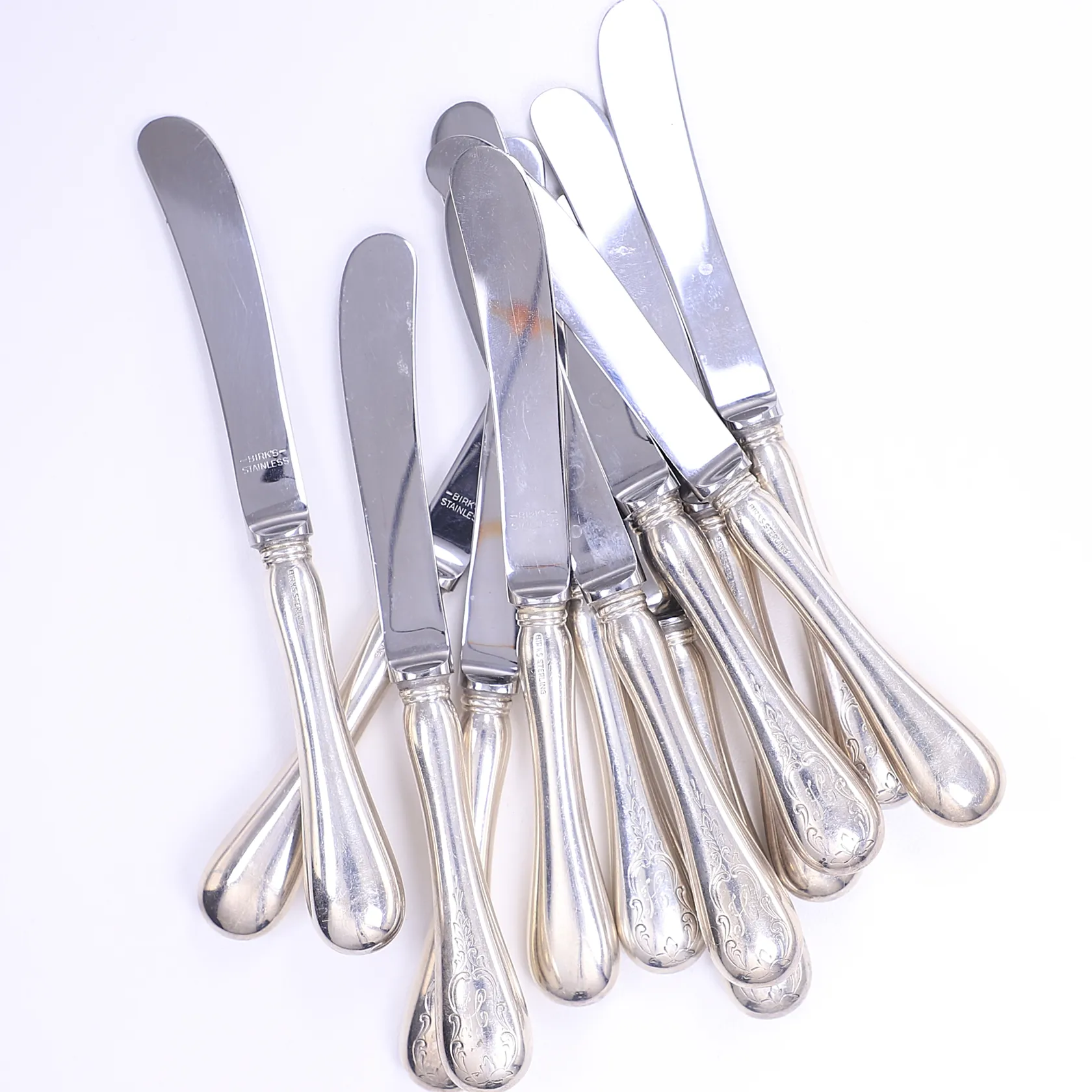 Parti bestick om 24 knivar, blad i rostfritt stå, tillv. Birks Jewellers Kanada, med tillhörande besticklinda, sterling silver 925/1000 Bruttovikt: 1659g Vikt: 1659 g.