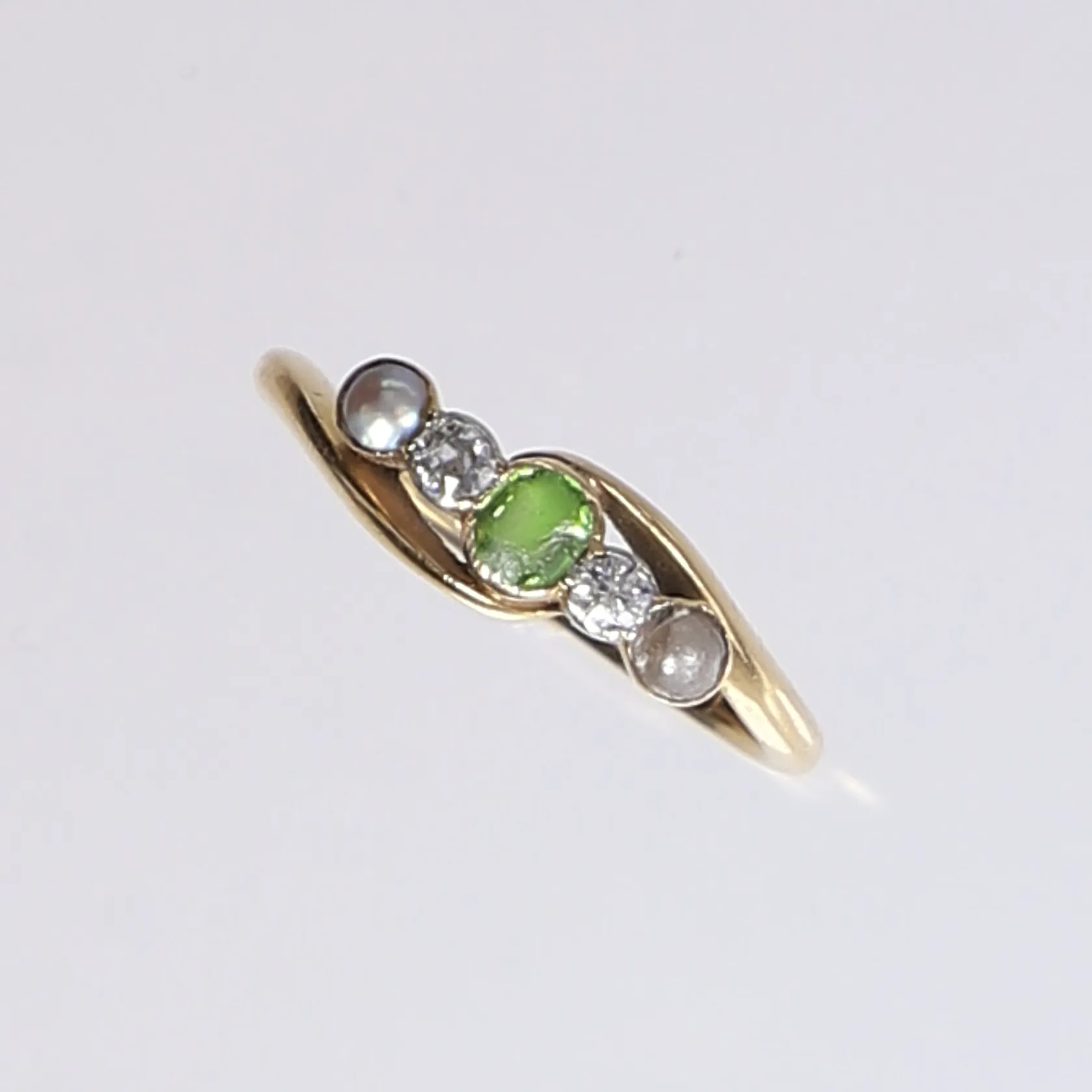 Ring med diamanter 2x ca 0,02ct, pärlor och grön sten, stl 16¾, bredd 1,5-5mm, nagg på grön sten, slitage, 21K Vikt: 2,8 g.