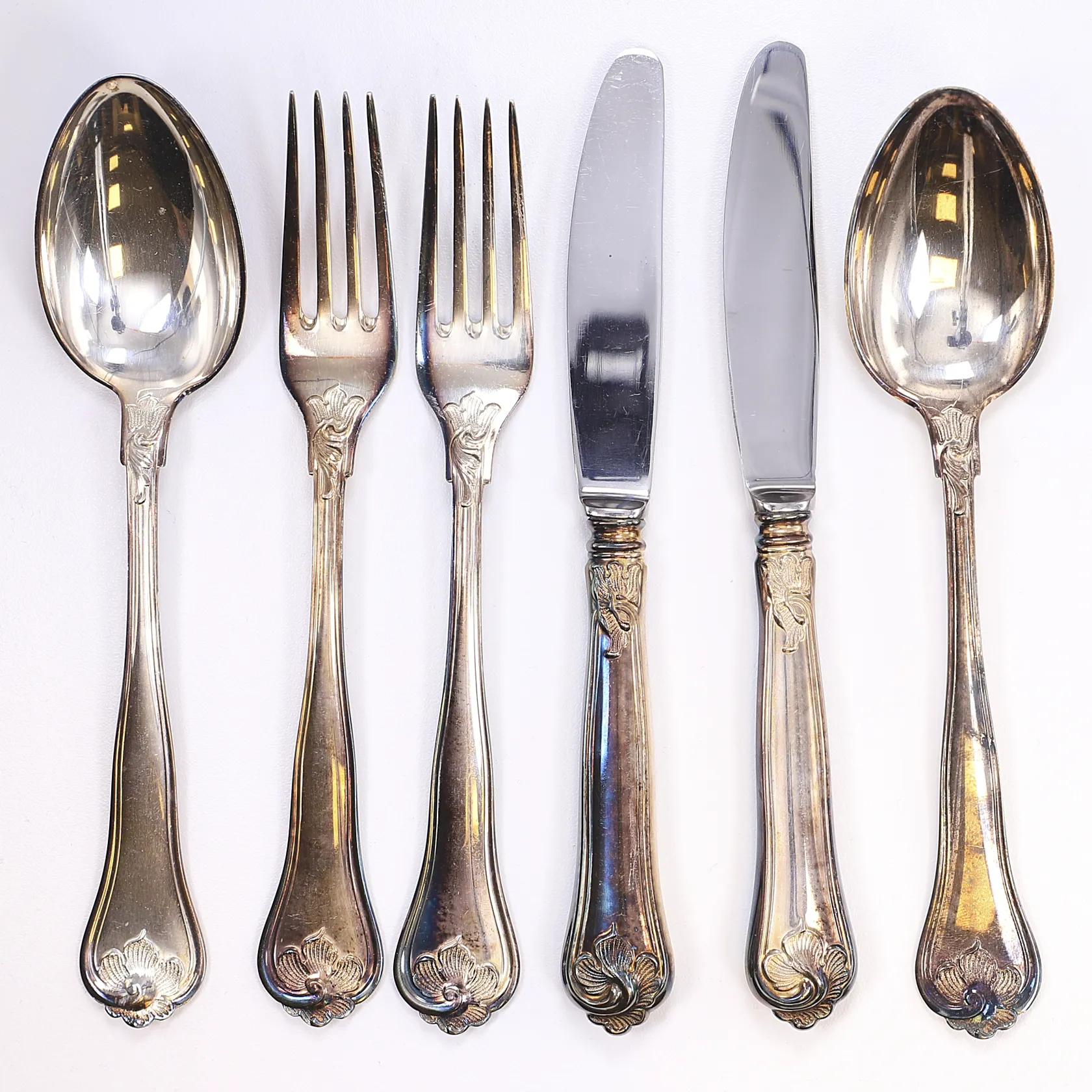 2 gafflar, 2 skedar, 2 knivar, blad på knivar rostfritt stål, danska stämplar, silver 830/1000 Bruttovikt: 283,4g Vikt: 283,4 g.