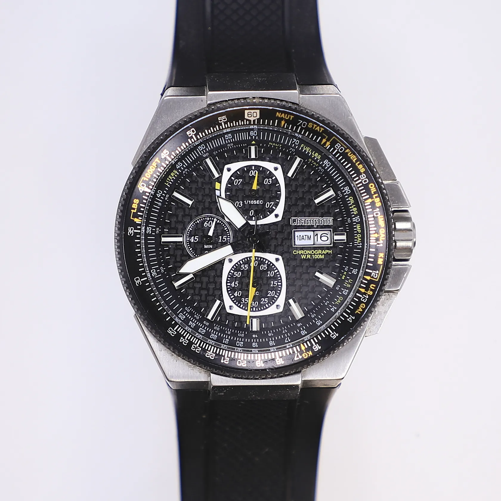 Herrur Champion Specter, Ø46mm, quartz, kronograf (återställer ej korrekt), datum, stål, ref CG218, serienummer: ZL-522, slitage, gummilänk, inga tillbehör