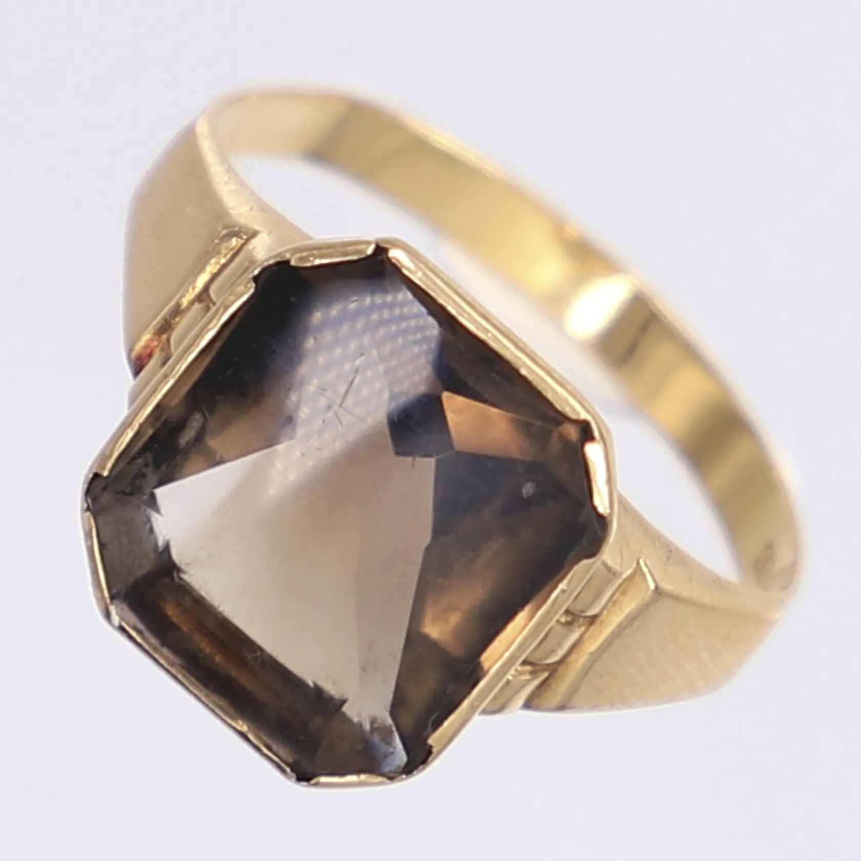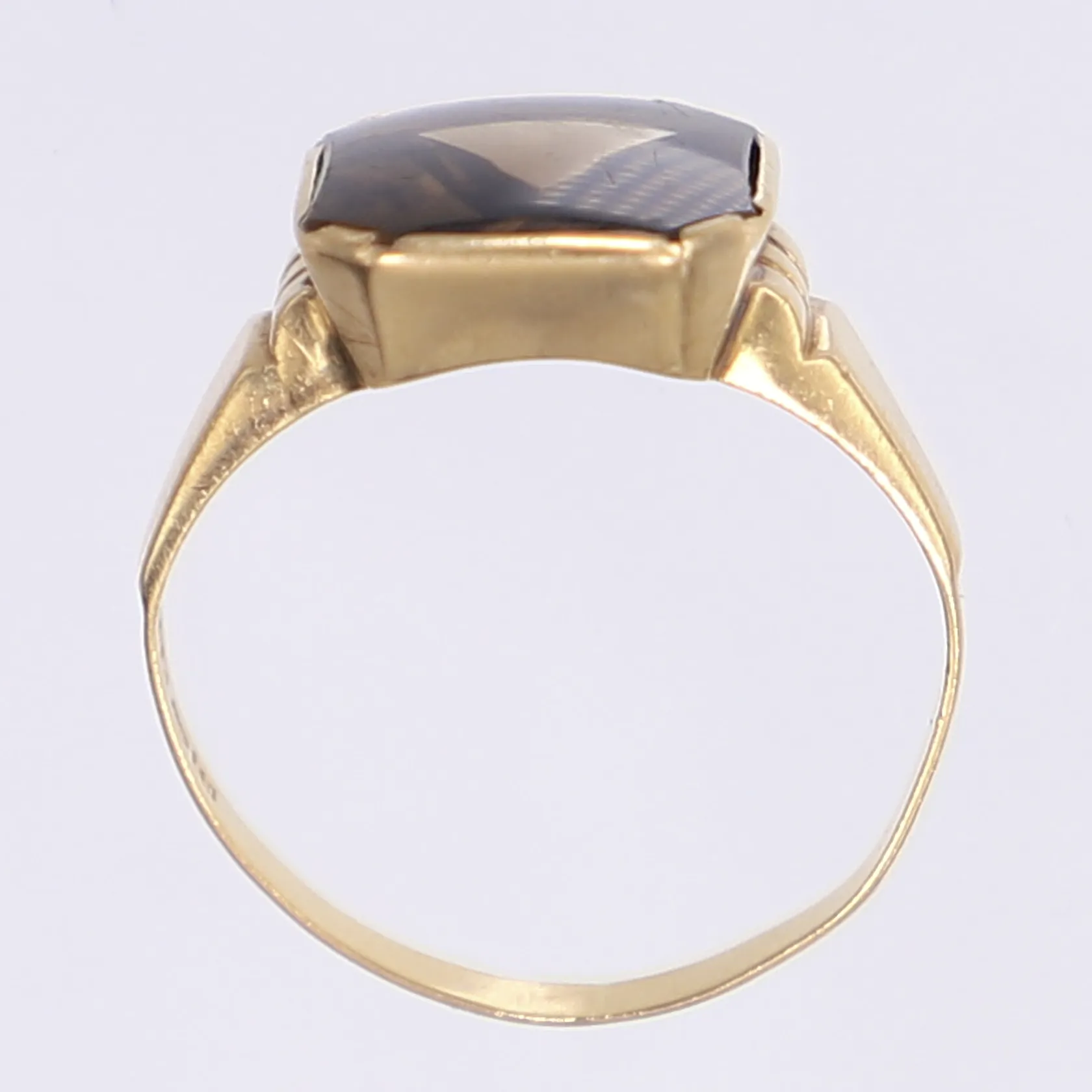 Klackring med brun sten, stl 19¼, bredd 3-15mm, Hallbergs, ojämn skena, bruksslitage, 18K Vikt: 4,1 g.