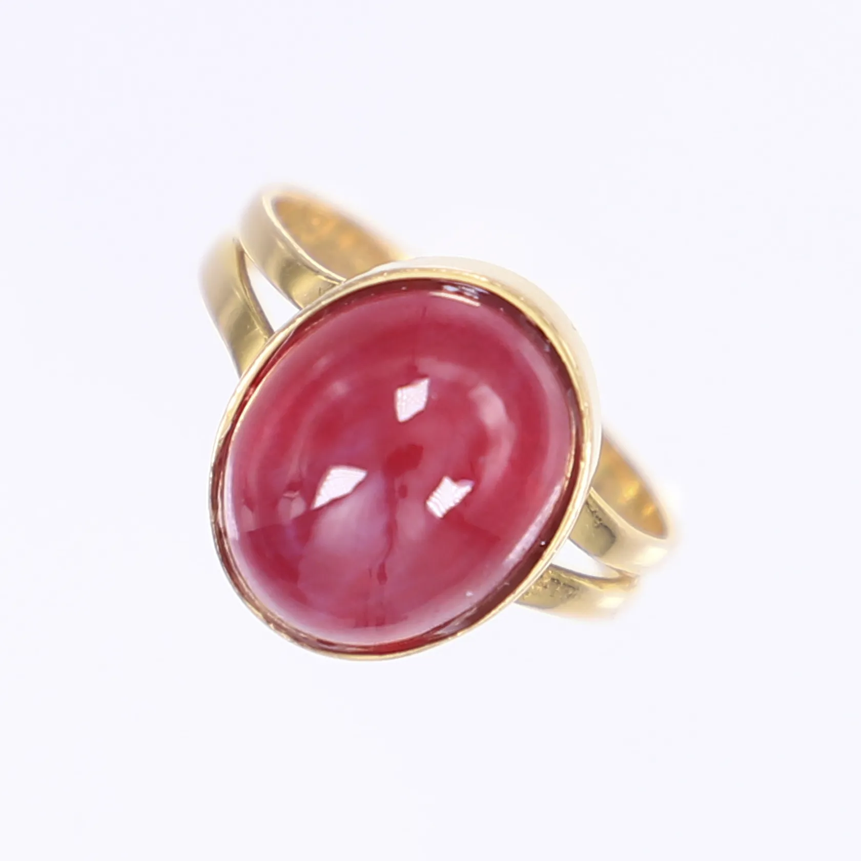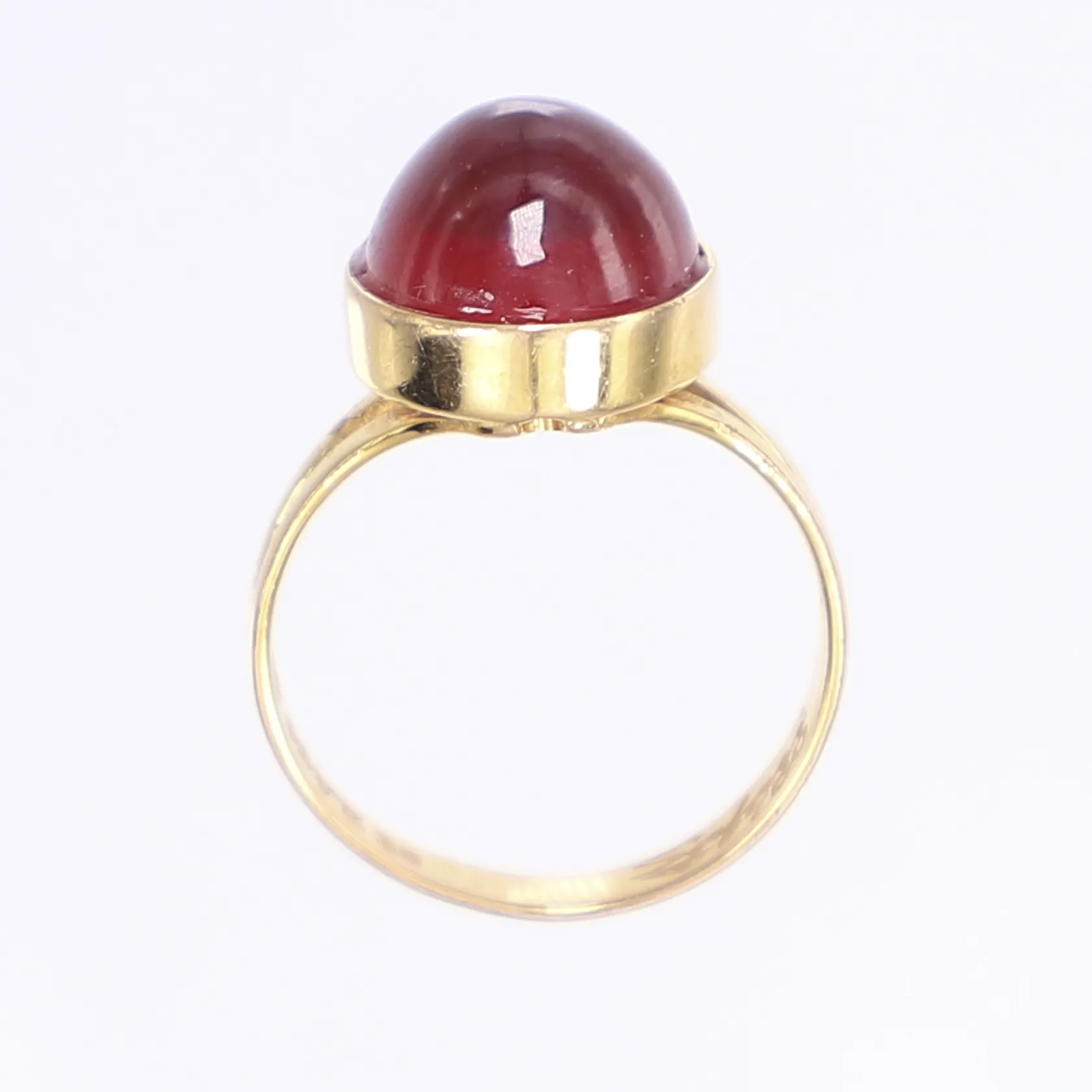 Ring med röd sten stl 18, bredd 3-15mm, limrester i/runt fattning, 18K Bruttovikt: 7,2g Vikt: 7,2 g.