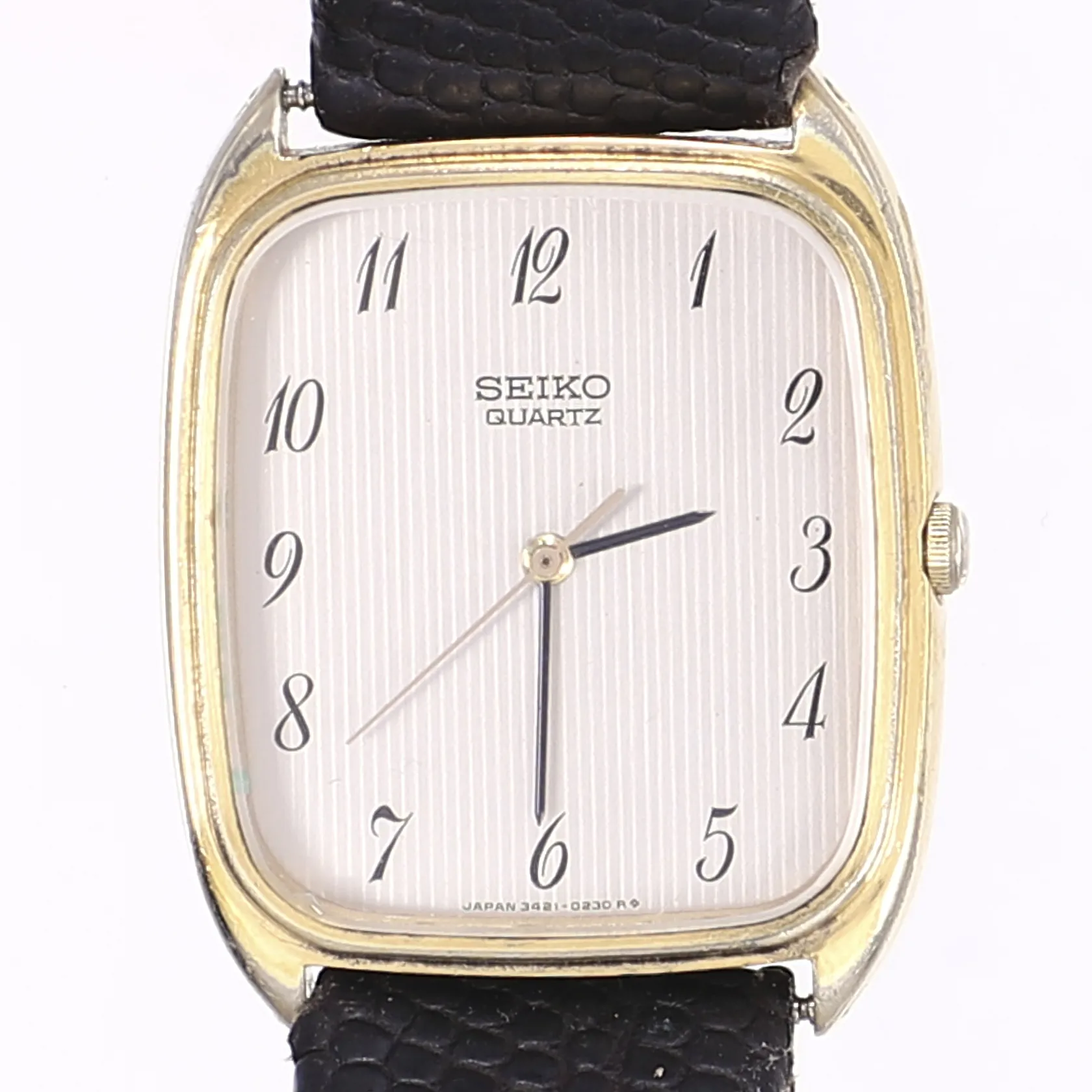 Herrur Seiko, 29x31(36)mm, quartz, ref 3421-5100, serienr 032442, dubblé/stål, sliten dubble, skadat läderband ej original, fungerande vid katalogiseringstillfället