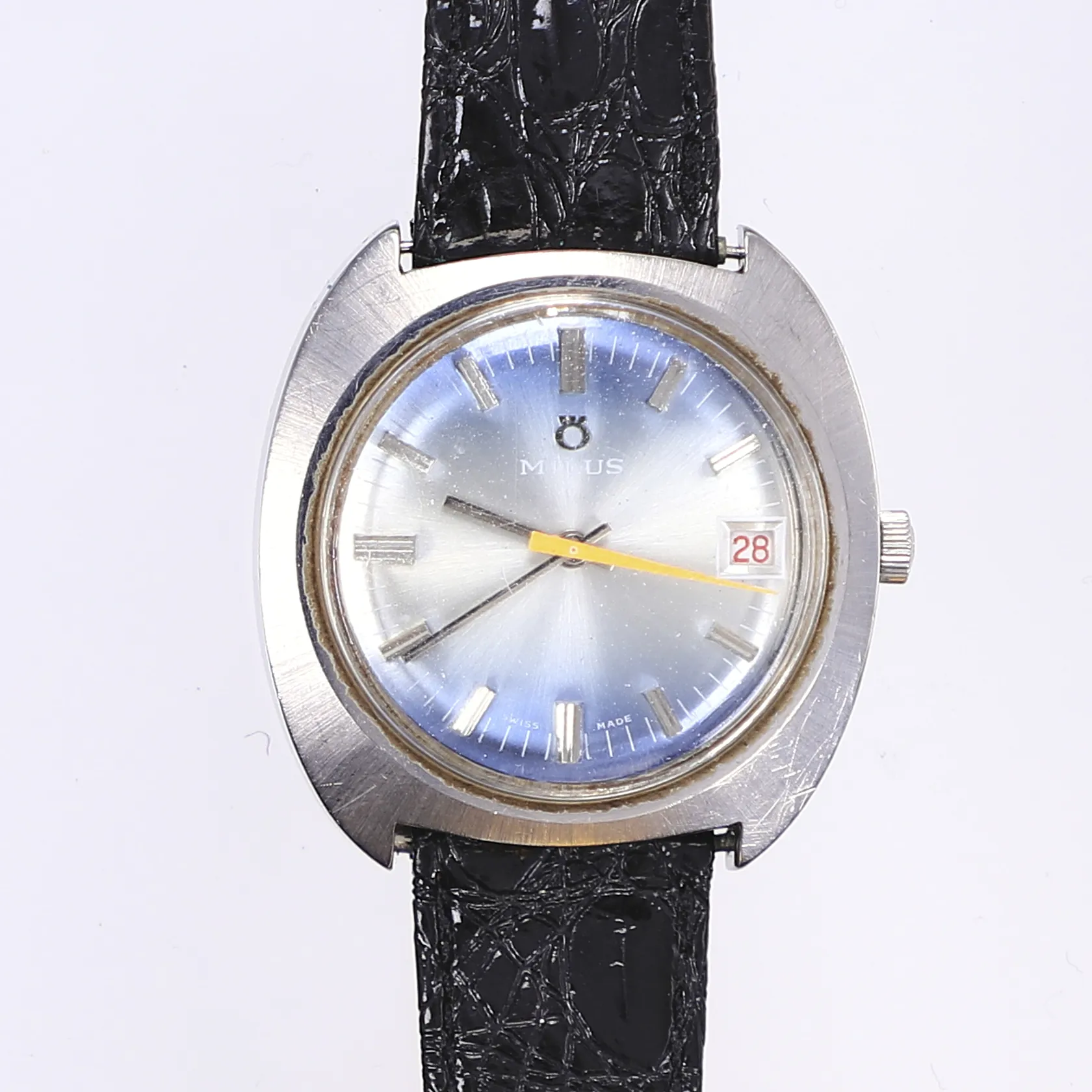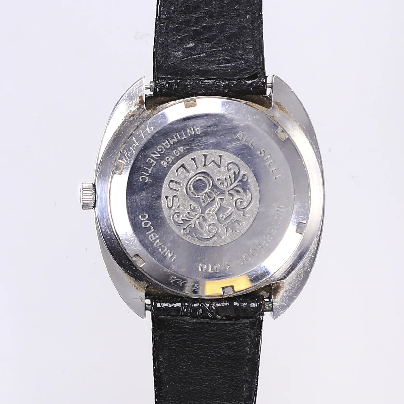 Herrur Milus, Ø36mm, manuell, datum, stål, snr 40156, slitage, repig boett och plexiglas, fungerar vid katalogiseringstillfället men ej testad för tidshållning, skadat läderband ej original, inga tillbehör