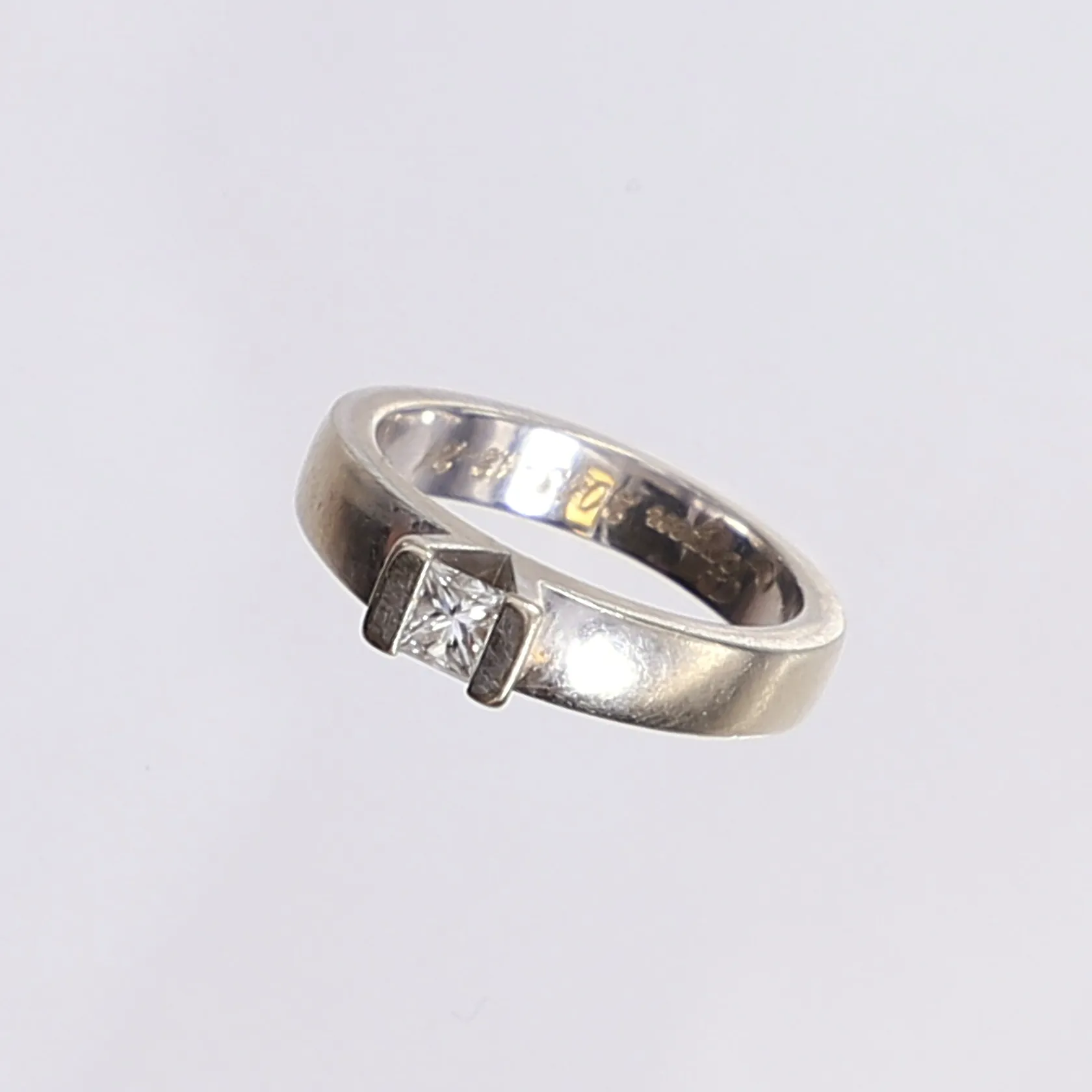 Ring med prinsesslipad diamant 1x 0,25ct enl. gravyr, stl 15¼, bredd 3,5-4mm, GHA, gravyr, vitguld 18K Vikt: 5,3 g.