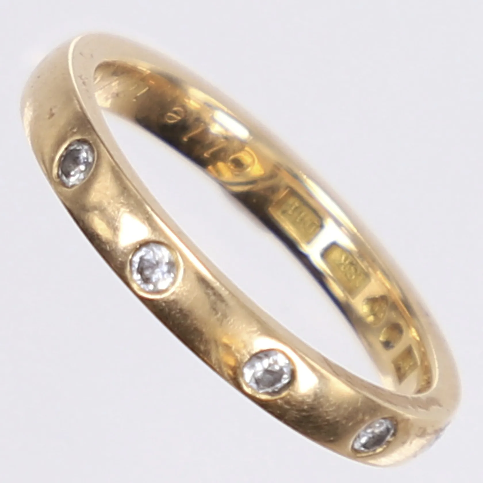 Ring med diamanter 5x ca 0,03ct, stl 17¾, bredd 3mm, gravyr, 18K Vikt: 4,5 g.