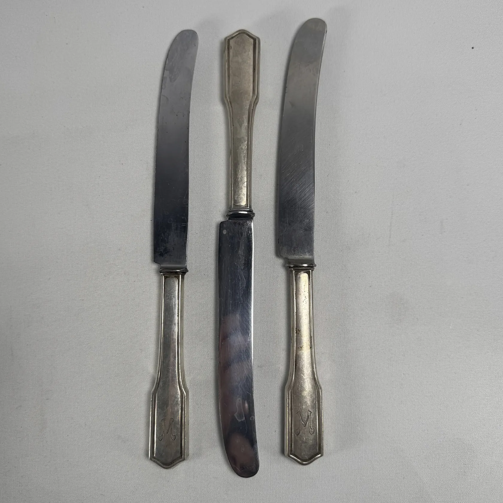 Tre knivar, blad i rostfritt stål, fyllda handtag, silver 800/1000 Bruttovikt: 249,4g Vikt: 249,4 g.