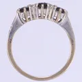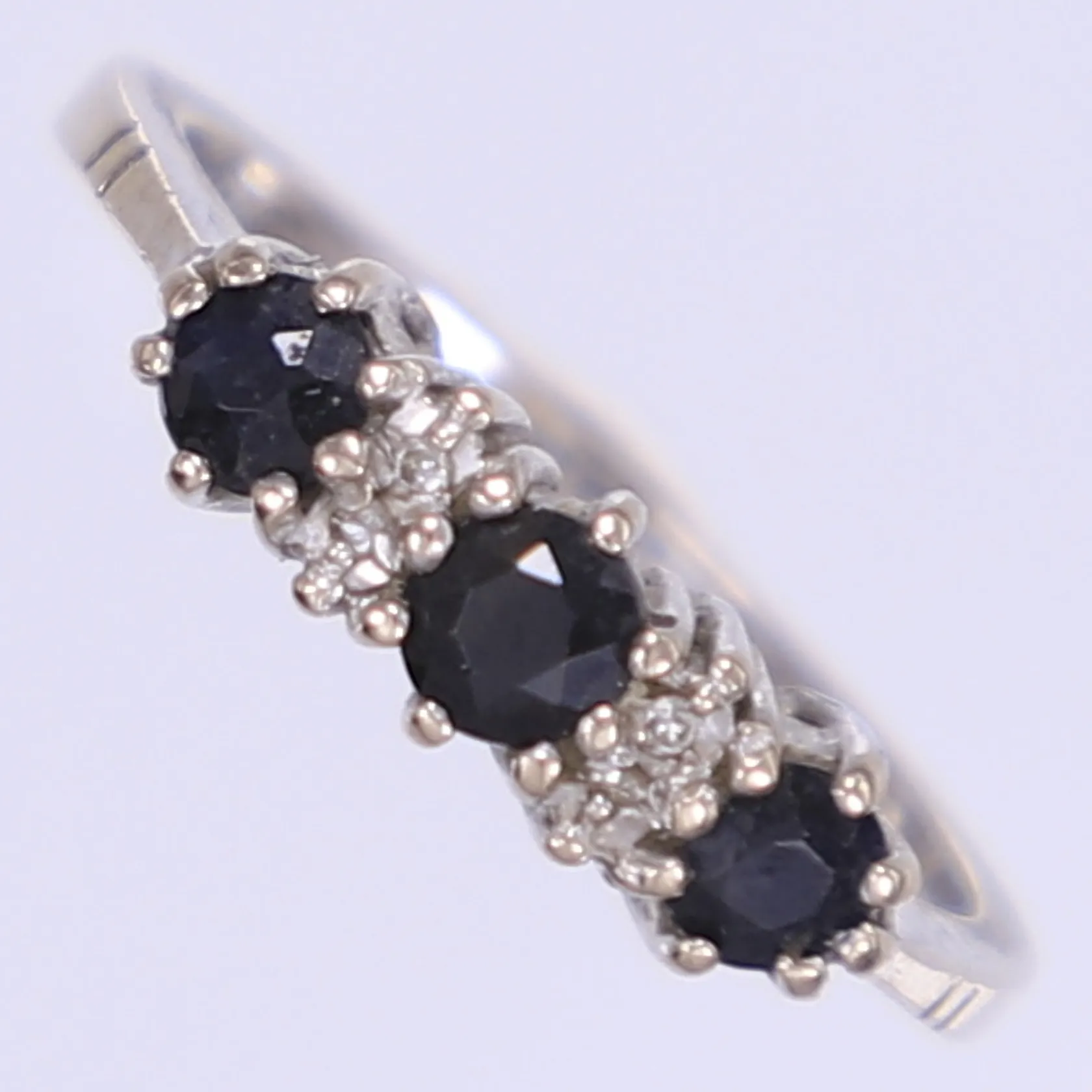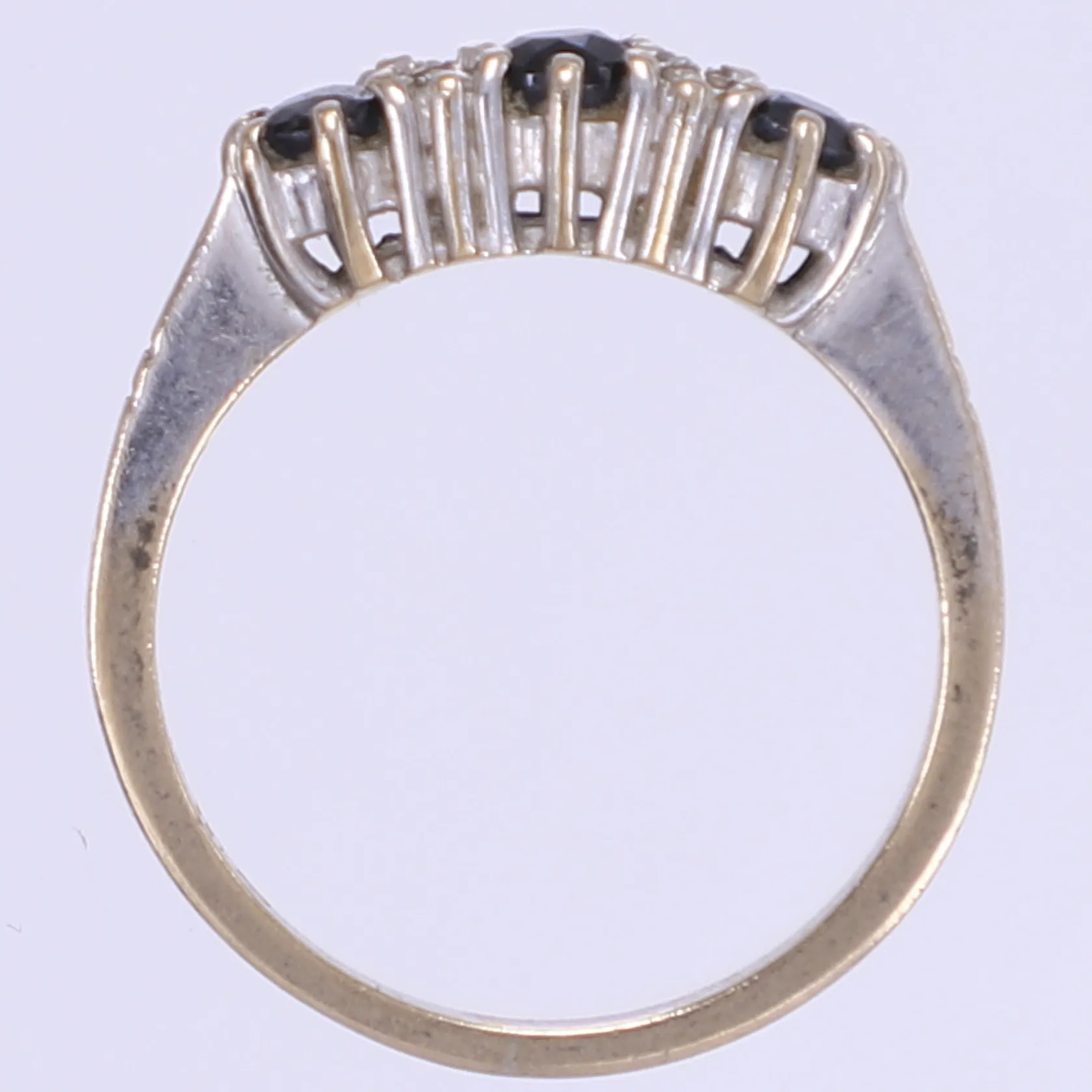 Ring med små diamanter och blå stenar stl 16¼, bredd 2-4mm, slitage, vitguld 18K Vikt: 3,1 g.