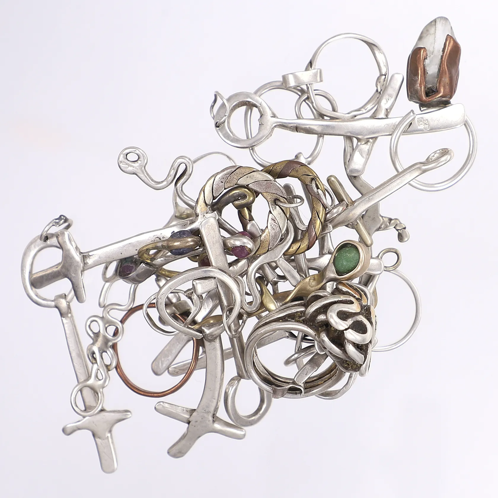 Diverse silver, delvis sten, delvis andra metaller, defekt, ostämplat silver Bruttovikt: 81g Vikt: 81 g.