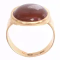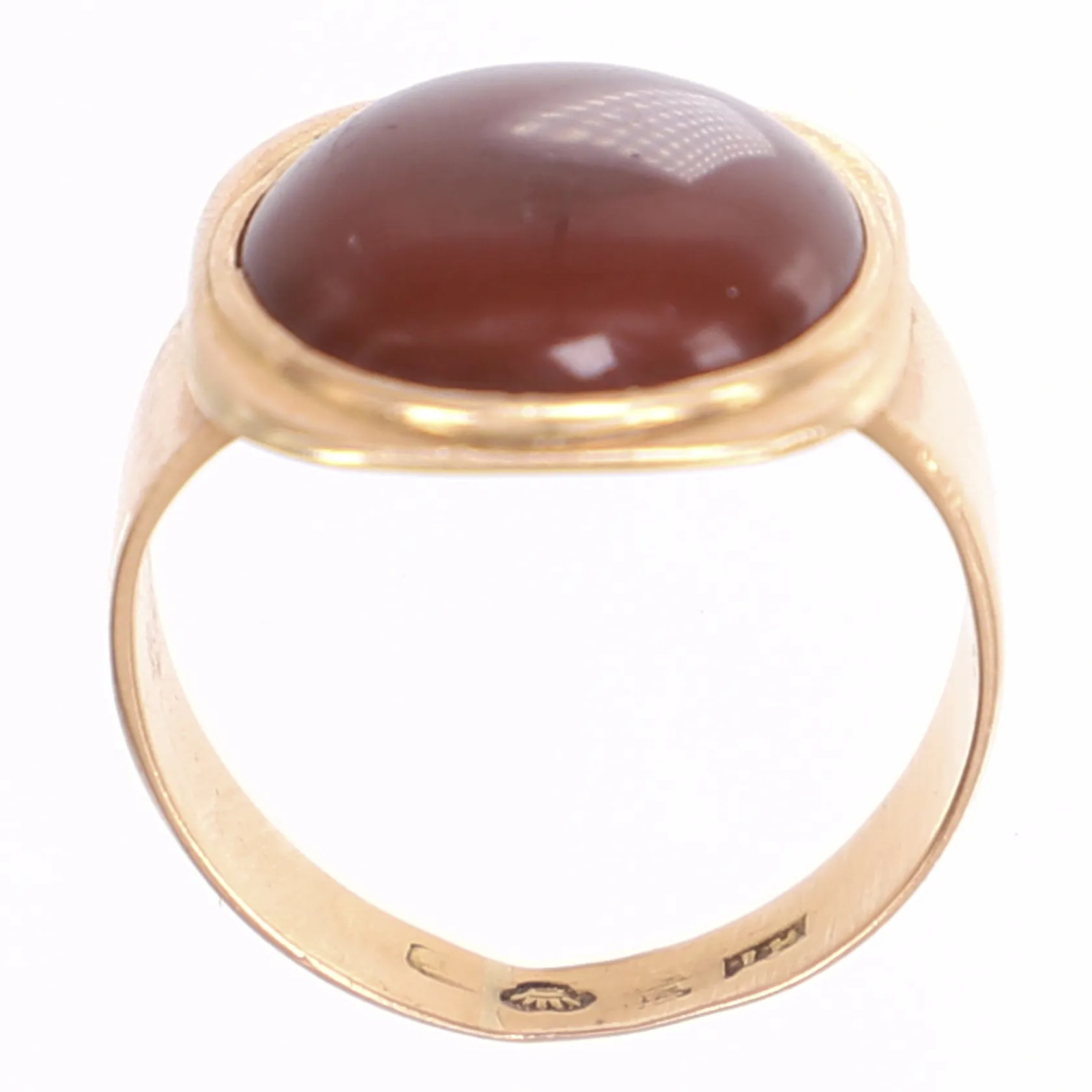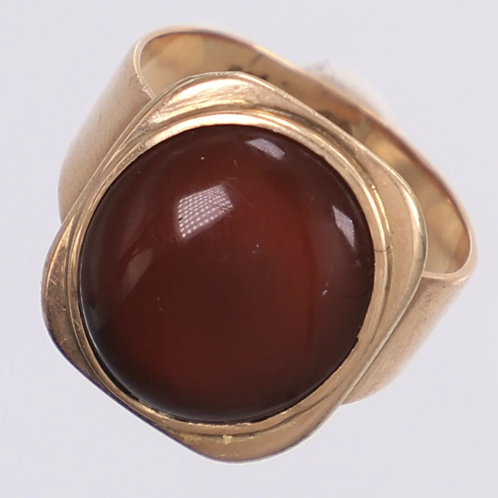 Ring med brun sten troligen karneol, stl ca 19, bredd 4-20mm, otydliga Finska stämplar, 14K Bruttovikt: 6,4g Vikt: 6,4 g.