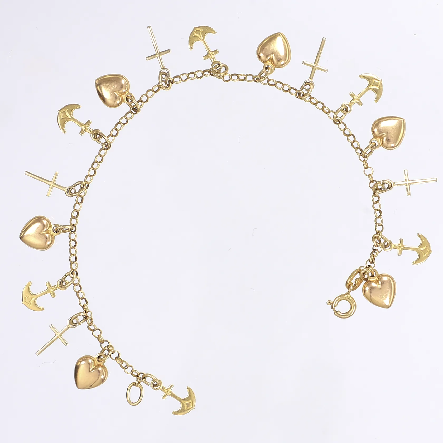 Armband med 17 berlocker, tro, hopp & kärlek, 19cm, bredd 2,5-16mm, italienska stämplar, 18K Vikt: 9 g.