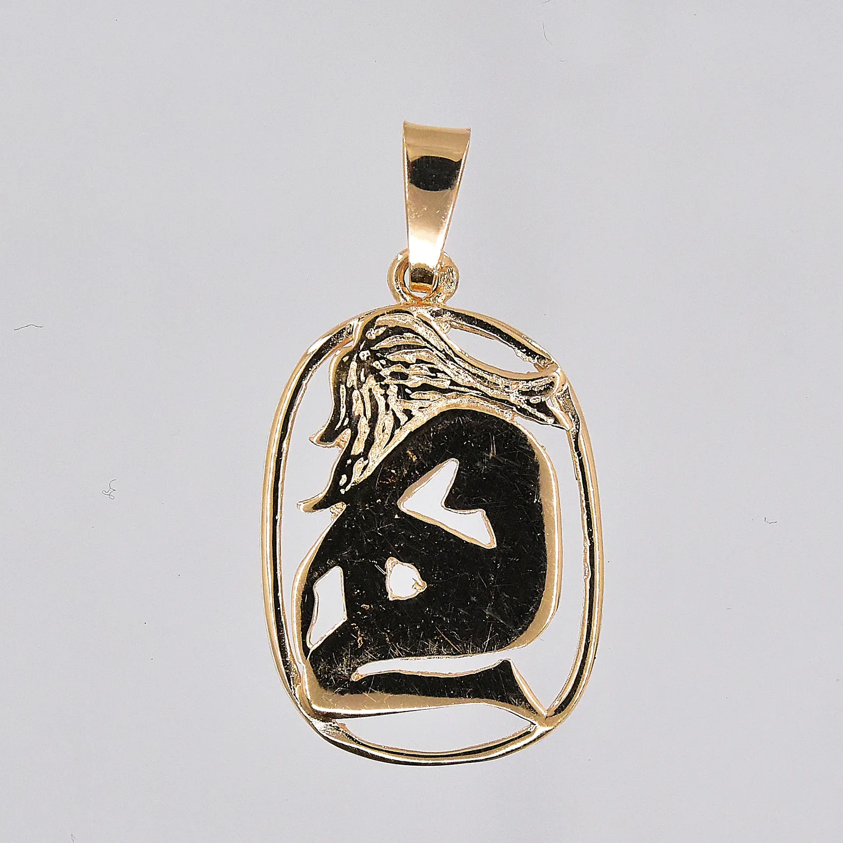 Hänge jungfrun, ca 14x26mm inklusive ögla, 18K Vikt: 1,7 g.