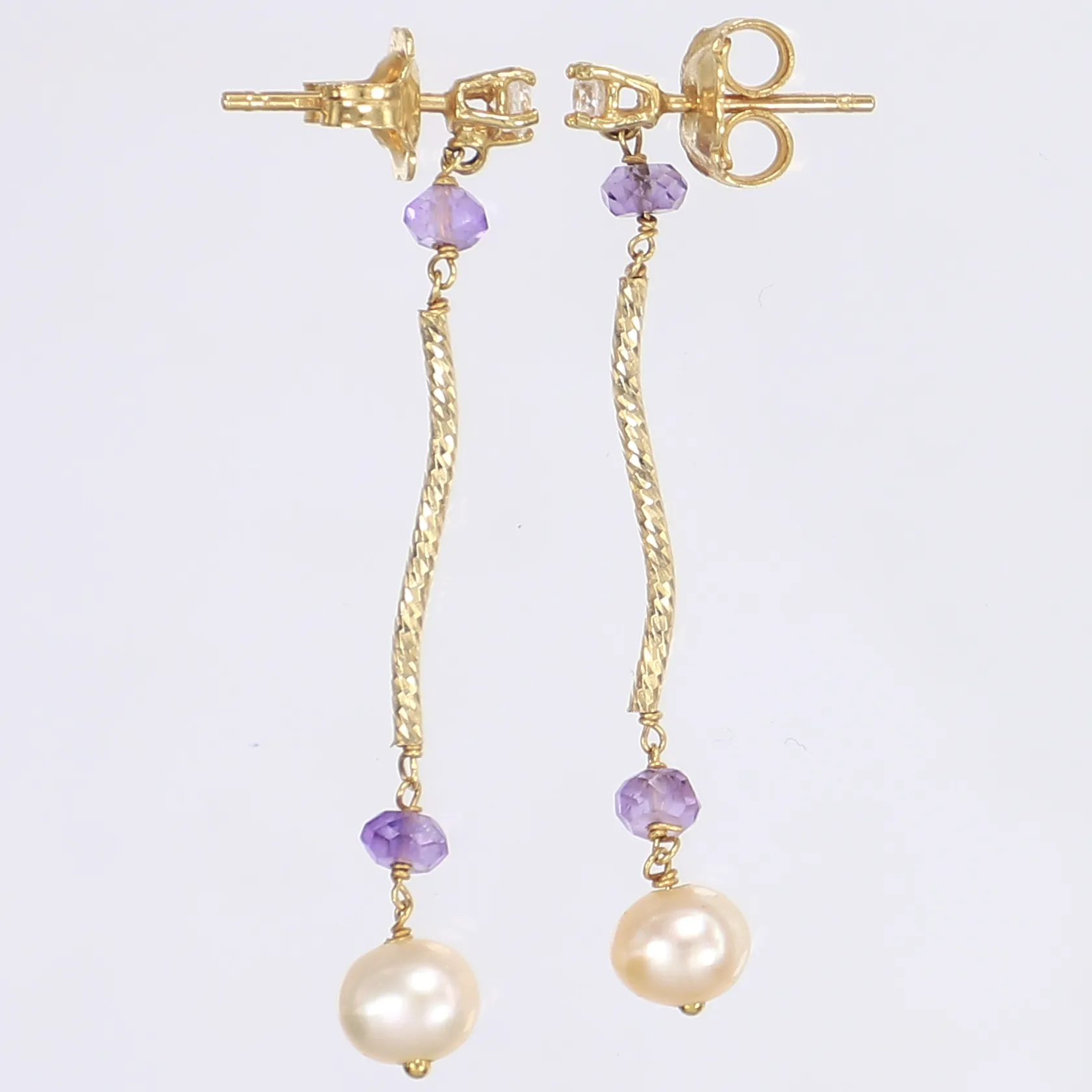 Ett par örhängen med lila och vita stenar och pärlor, höjd 45mm, 18K Bruttovikt: 2,1g Vikt: 2,1 g.