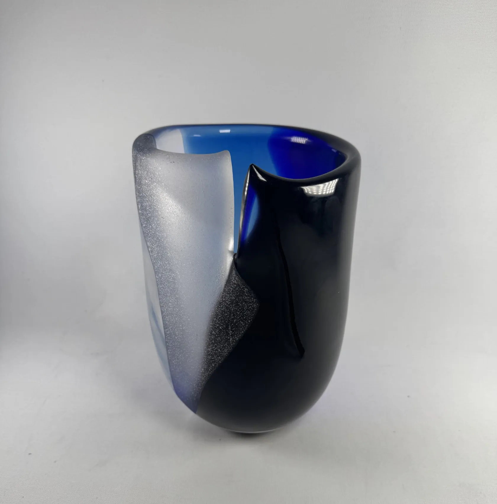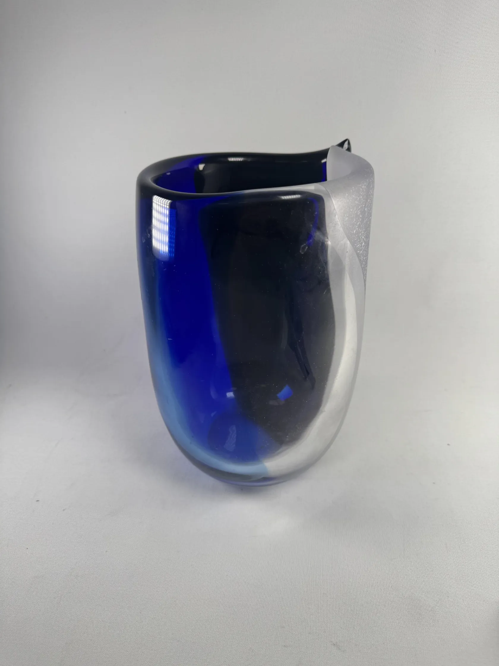 Vas, Mats Johansson, Målerås Glasbruk, höjd 25cm, Ø15cm, blå och klar glasmassa med frostad dekor, signerad 4871, 31/99, RF/PJ, naggad i botten Skickas med postpaket.