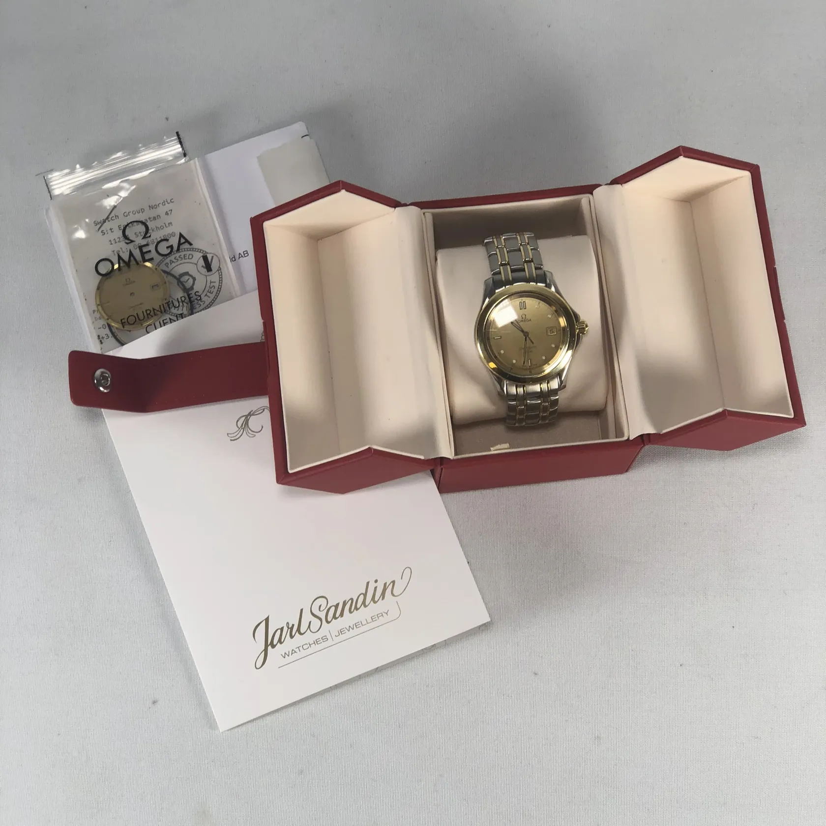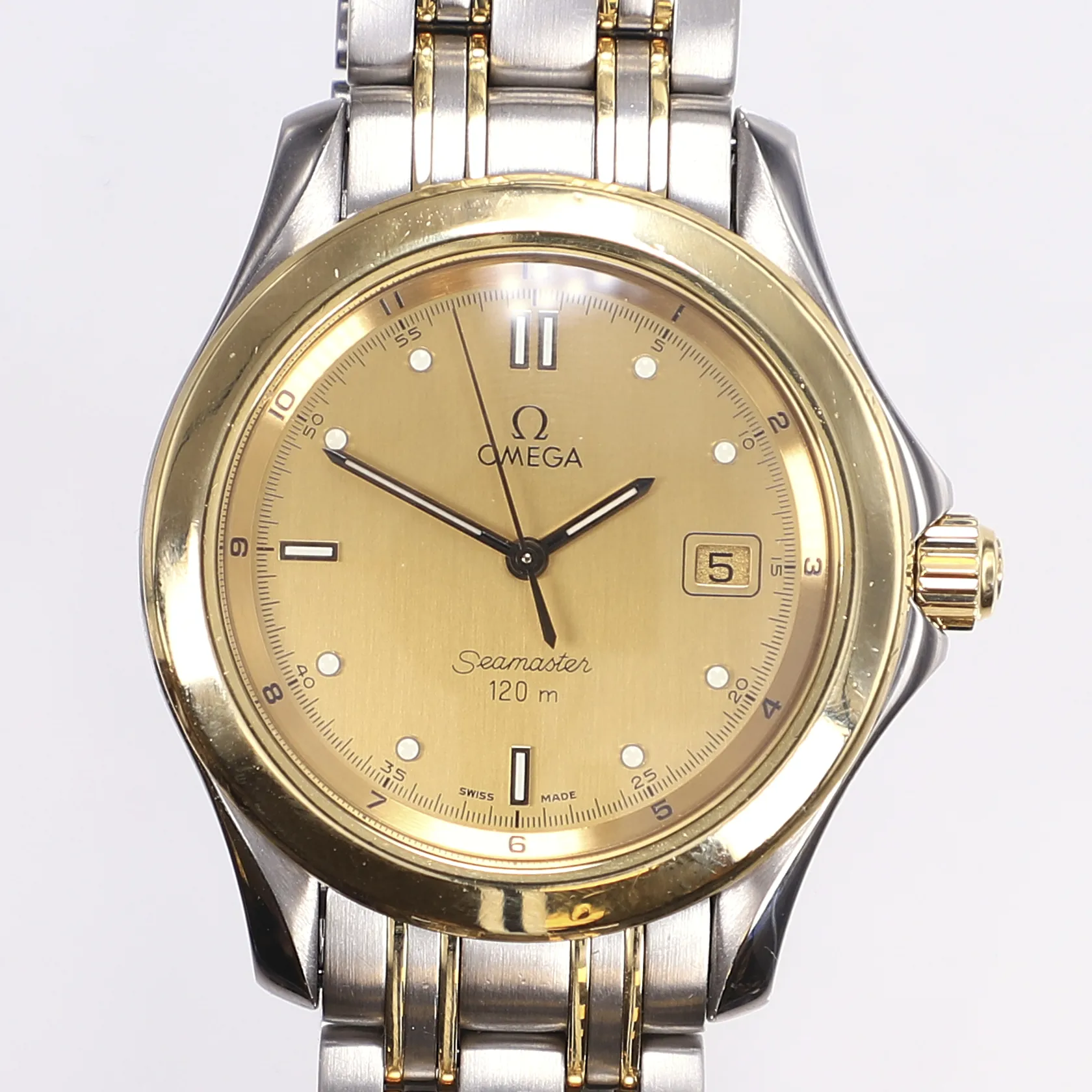 Herrur Omega Seamaster 120, Ø36mm, quartz, datum, guld/stål, ref DA.196.1501, serienummer 54950049, länk 151/823, kort länk ca 13cm, smärre kosmetiskt slitage, med serviceetui och servicekvitto från Jarl Sandin 2025, krona, urtavla, och visare utbytta under service originaldelar medföljer