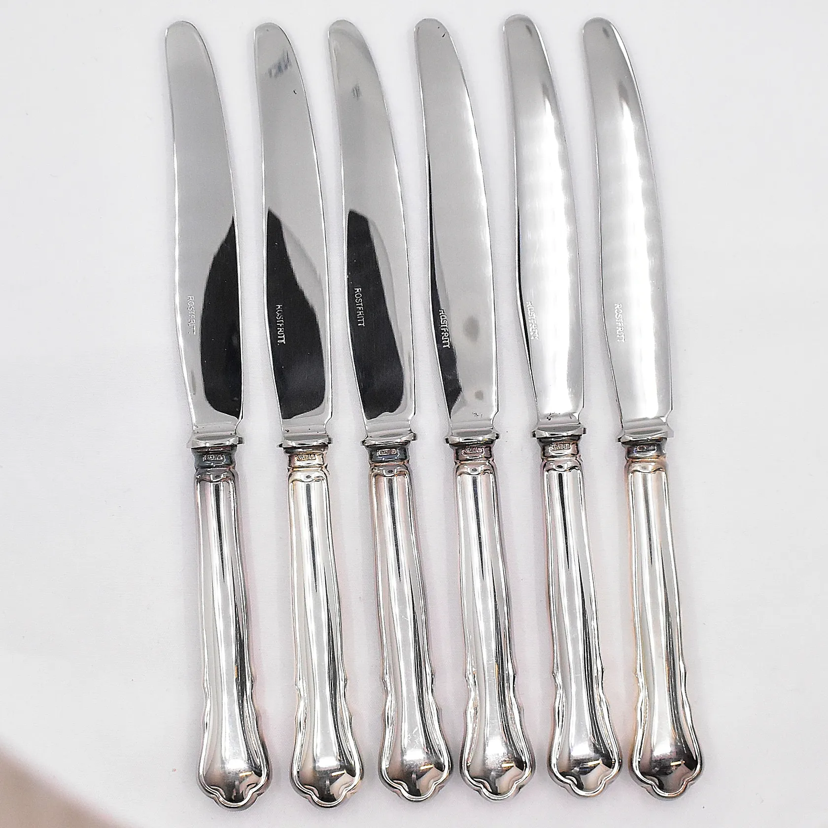 6 bordsknivar, modell Chippendale, GAB, längd 20cm, blad i stål, 830/1000 silver Vikt: 367 g.