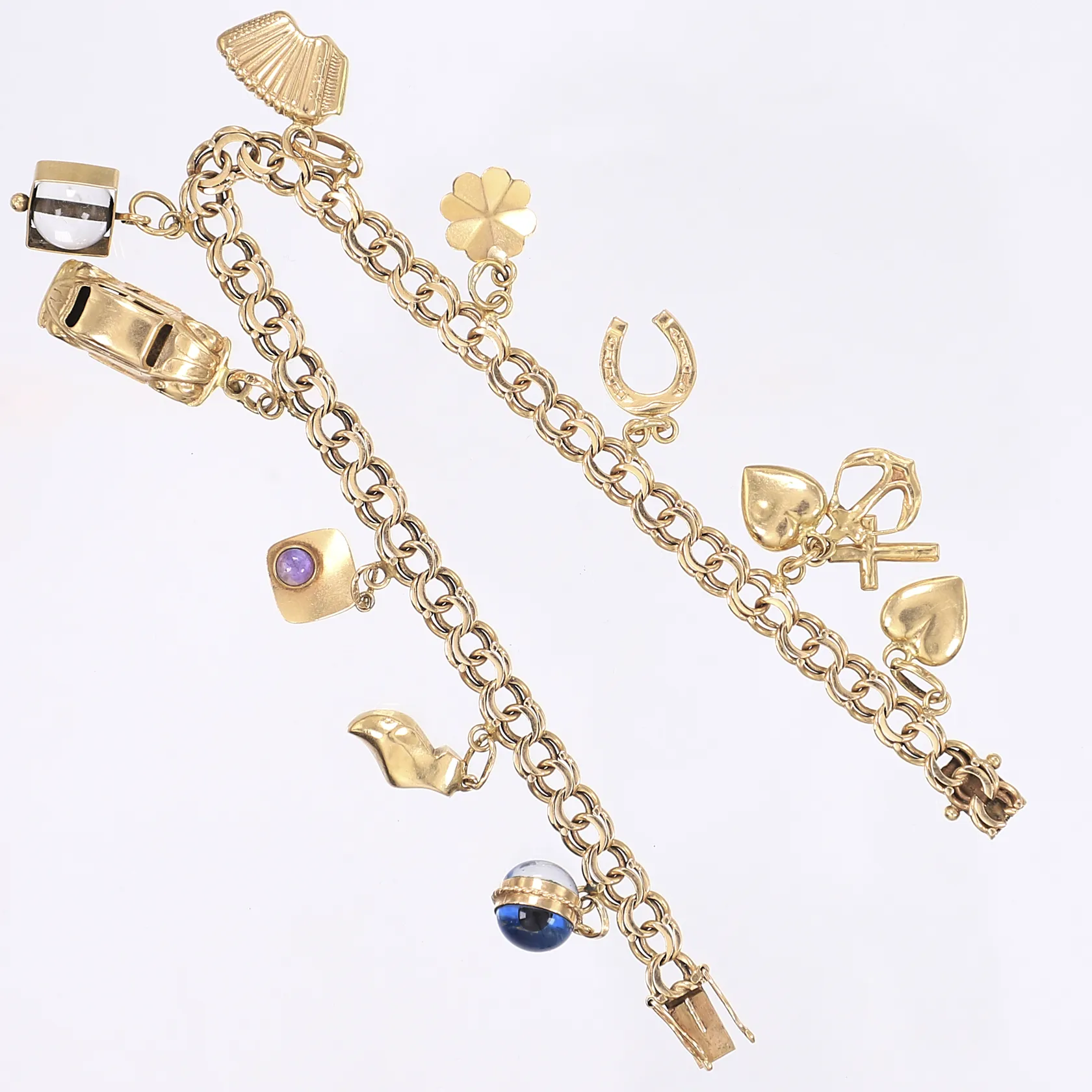 Armband med 10 hängen, varav tre med stenar, armbandet tillverkat i Stockholm 1961, enstaka bucklor, längd 21cm, 18K Vikt: 20,2 g.