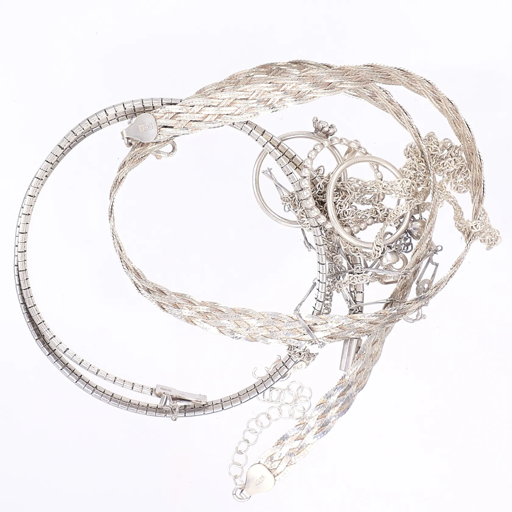 4 Kedjor, 1 Armband, 3 Ringar stl 18¾, kedjornas längd 40-45cm, armbandet defekt, silver 830-925/1000 Vikt: 38,7 g.