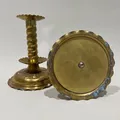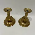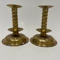 Ett par ljusstakar, barockstil i mässing, vriden stam, dekor i relief, ca 16cm, bredd ca 13cm, S. Fong, handarbete, bruksskick, stearinrester. Skickas med postpaket.