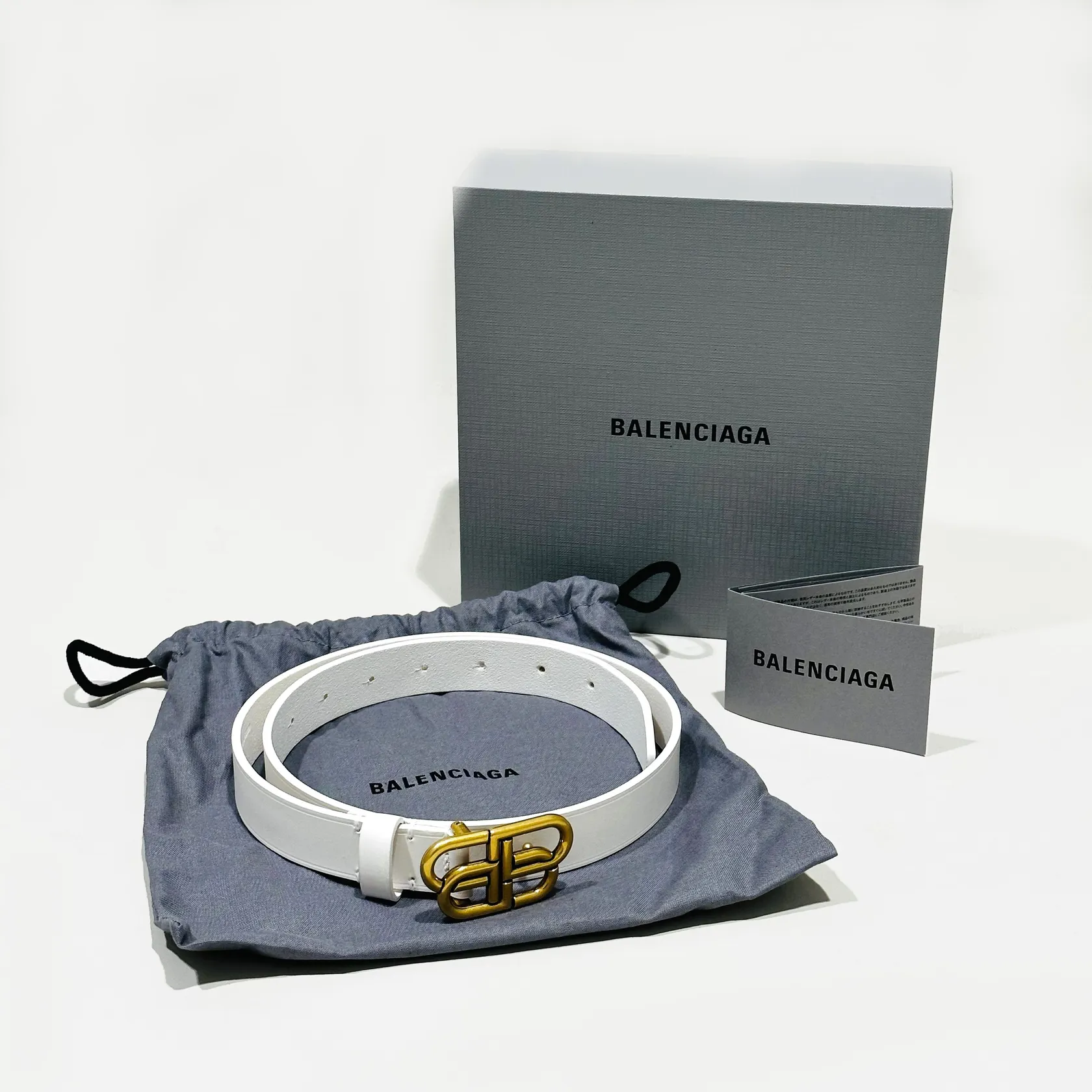 Bälte, Balenciaga , vit läder med guldfärgad metall, size 75, längd ca 90cm, bredd 2,5-3cm, nr 581690.9000.W.505293.75, bruksskick, kvitto från Balenciaga NK 2020, dustbag, box. Visas hos Pantbanken Östermalm, Storgatan 8, Stockholm. Skickas med postpaket.