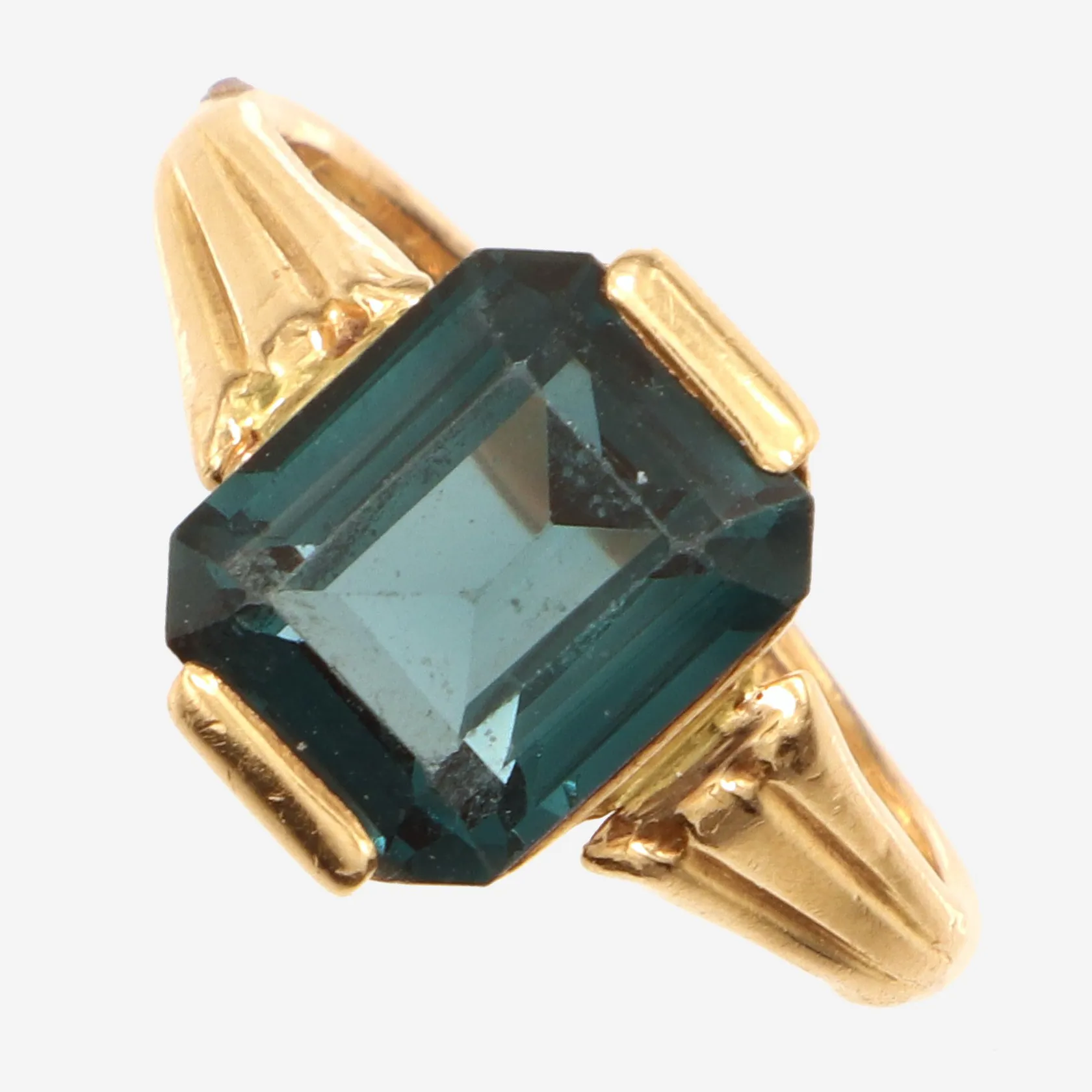 Ring med grön syntetisk spinell, stl 17, bredd ca 2-12mm, gravyr, repig, 18K Vikt: 4,1 g.