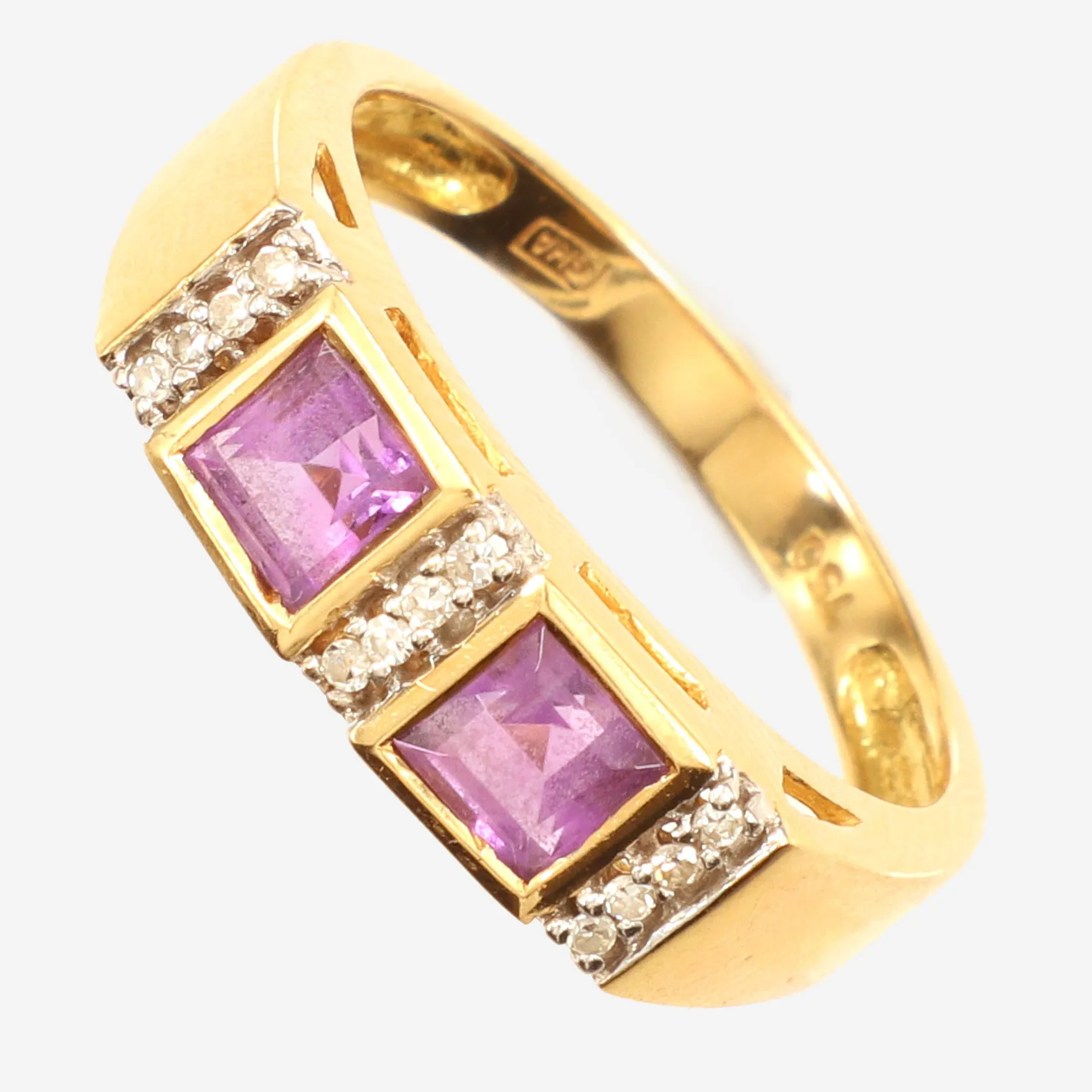 Ring med diamanter ca 12 x 0,0025ct samt lila stenar, stl 16¾, bredd ca 2-5mm, Guldfynd, 18K Vikt: 3,2 g.