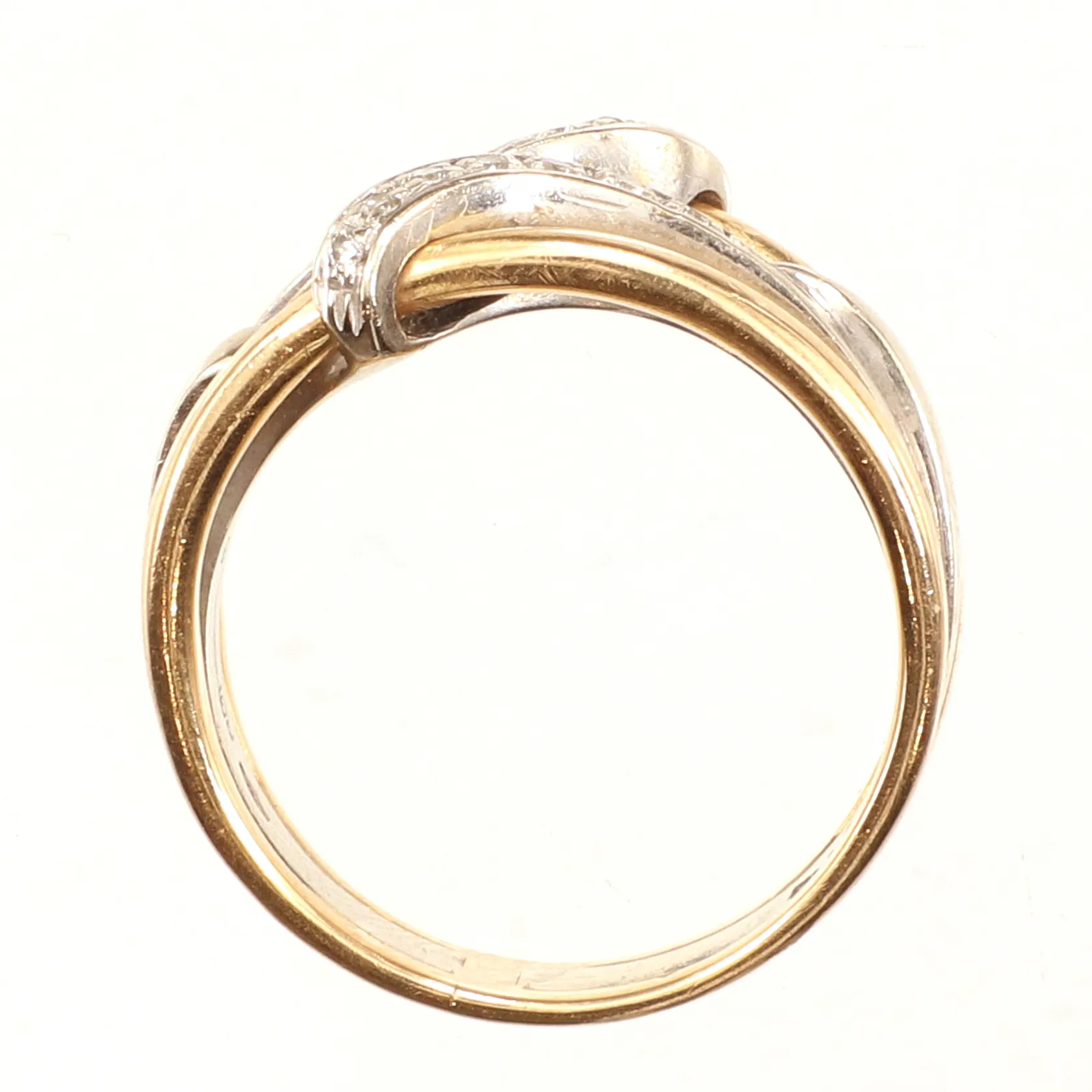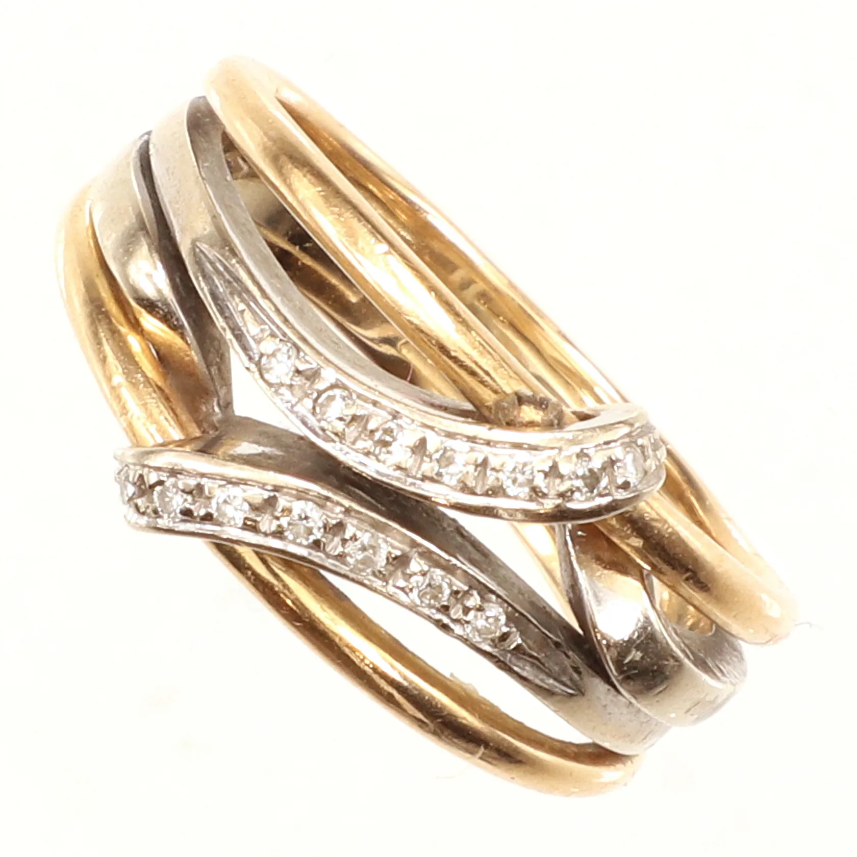Ring med diamanter ca 14 x0,01ct, tvåtonad, stl 18, bredd ca 10mm, 18K Vikt: 8,7 g.