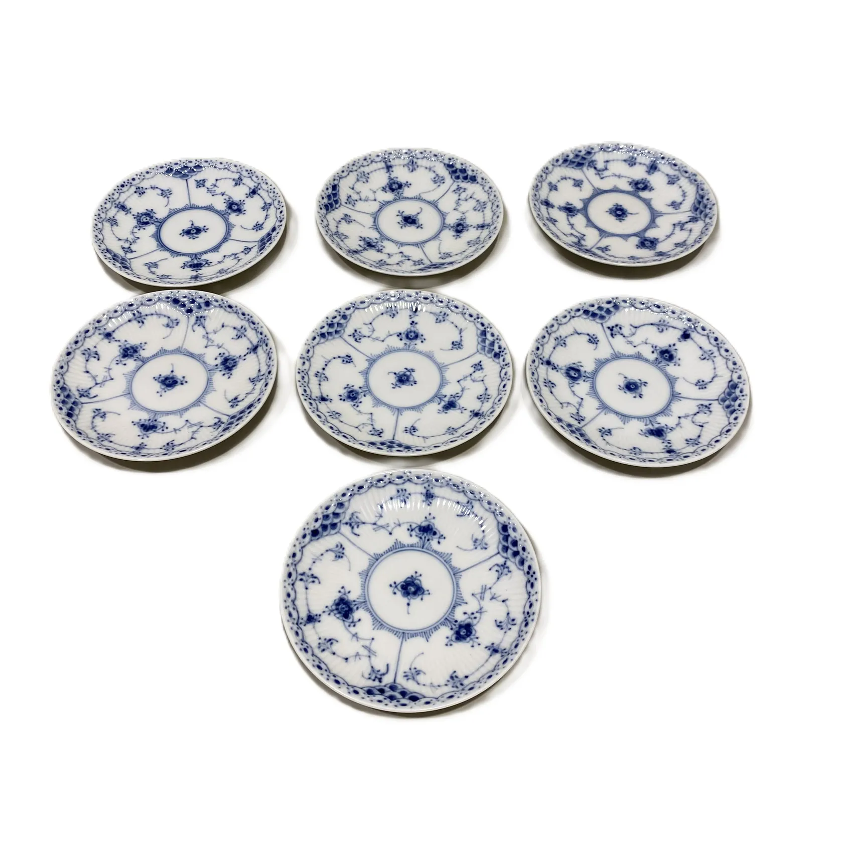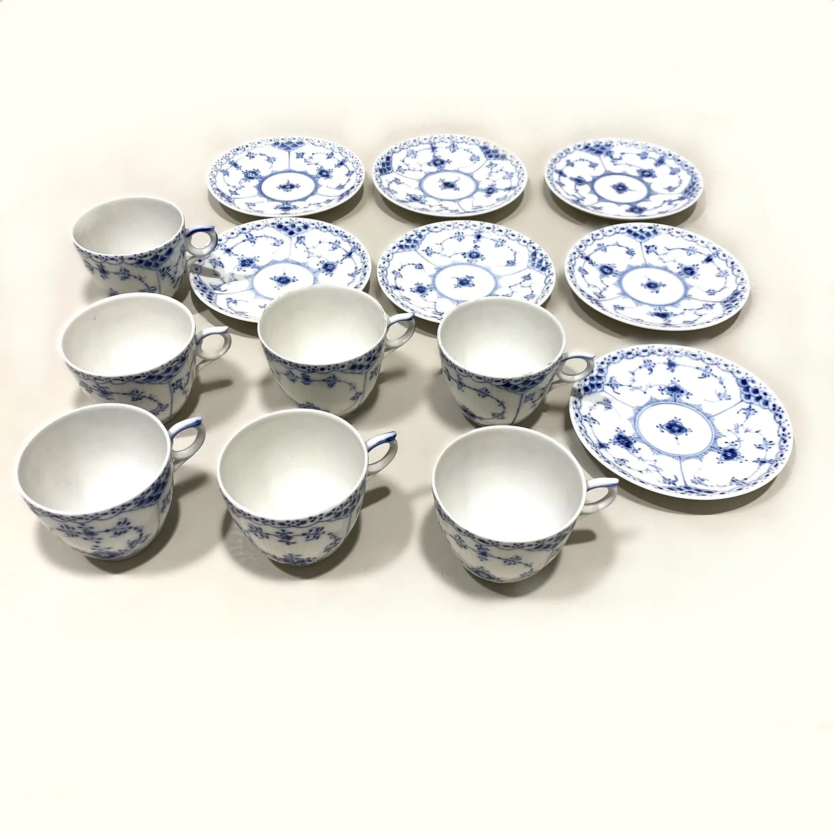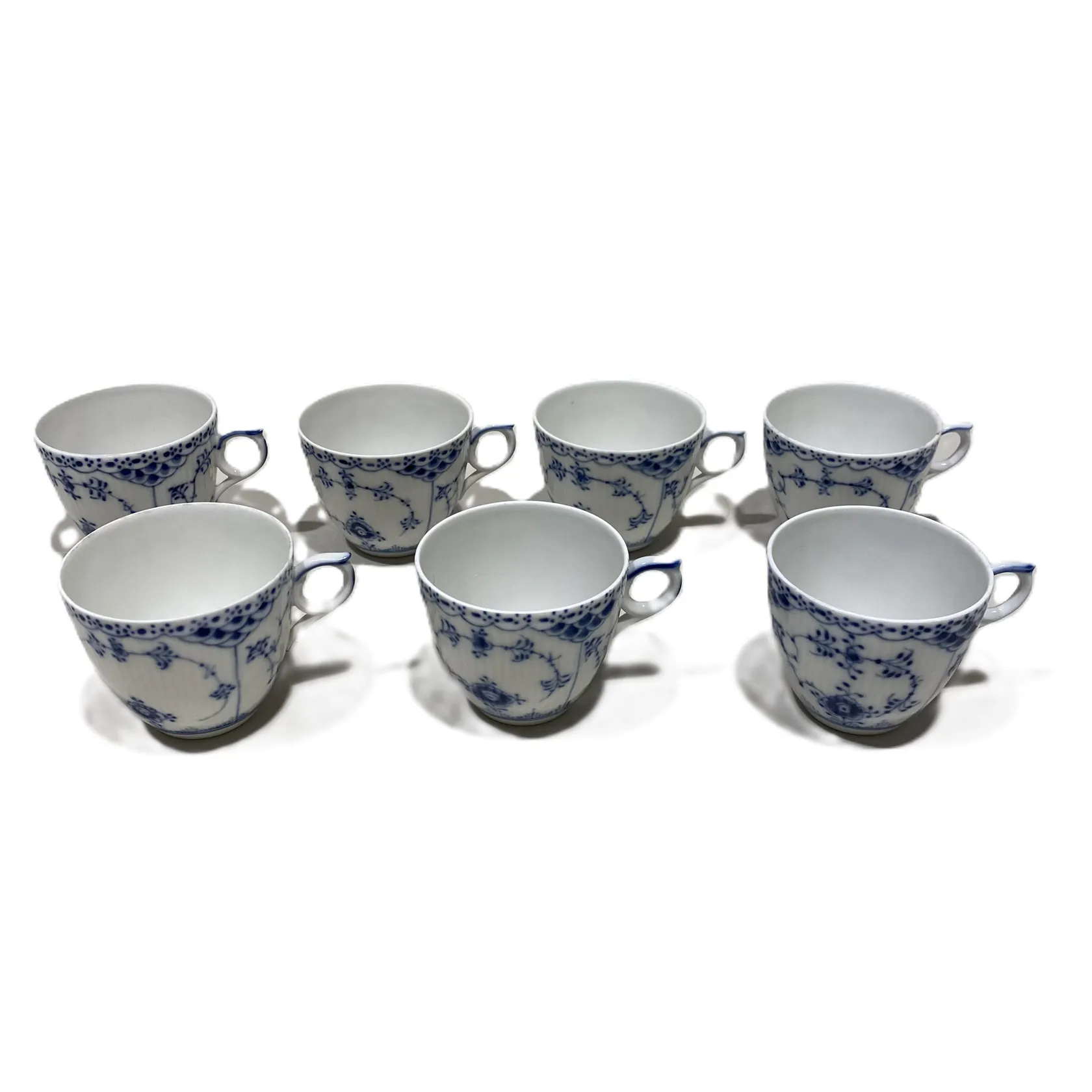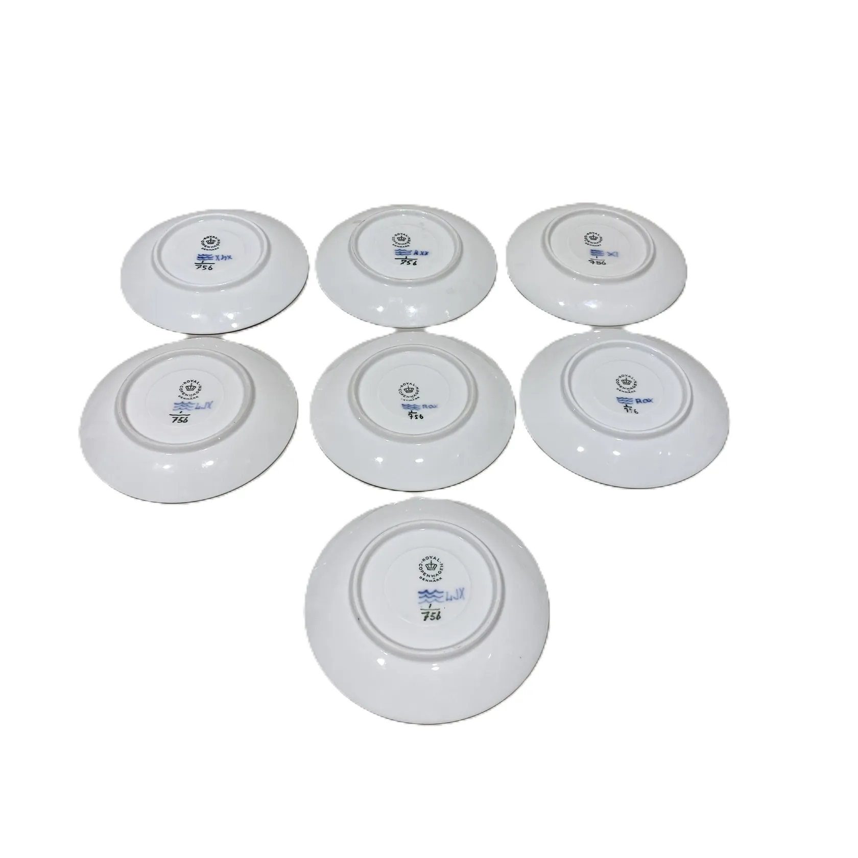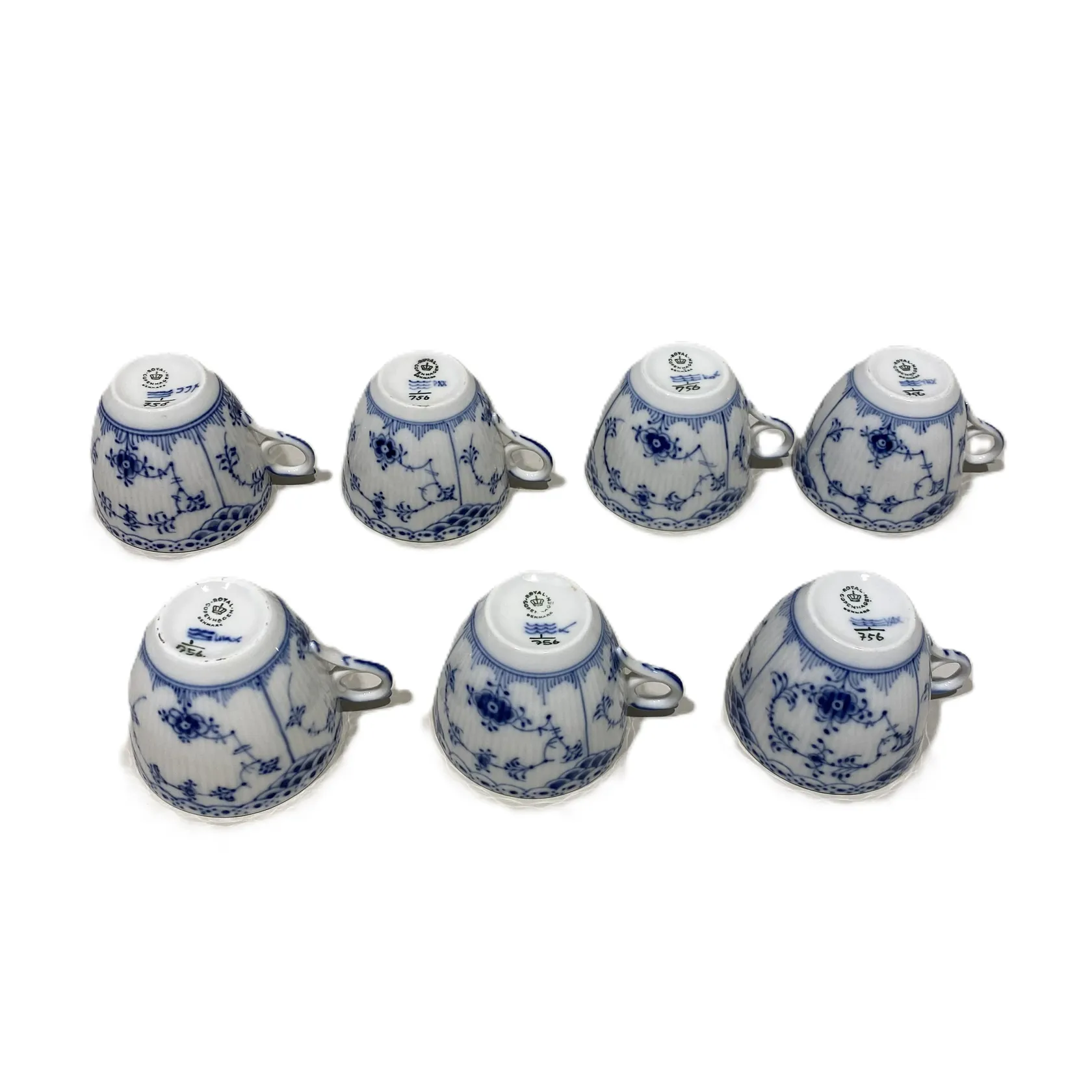 Sex kaffekoppar med 7 fat, koppar längd 7cm, Ø7,5cm, fat Ø13cm, Nr 756, Musselmalet, Royal Copenhagen Denmark, fläckar, Skickas med postpaket.