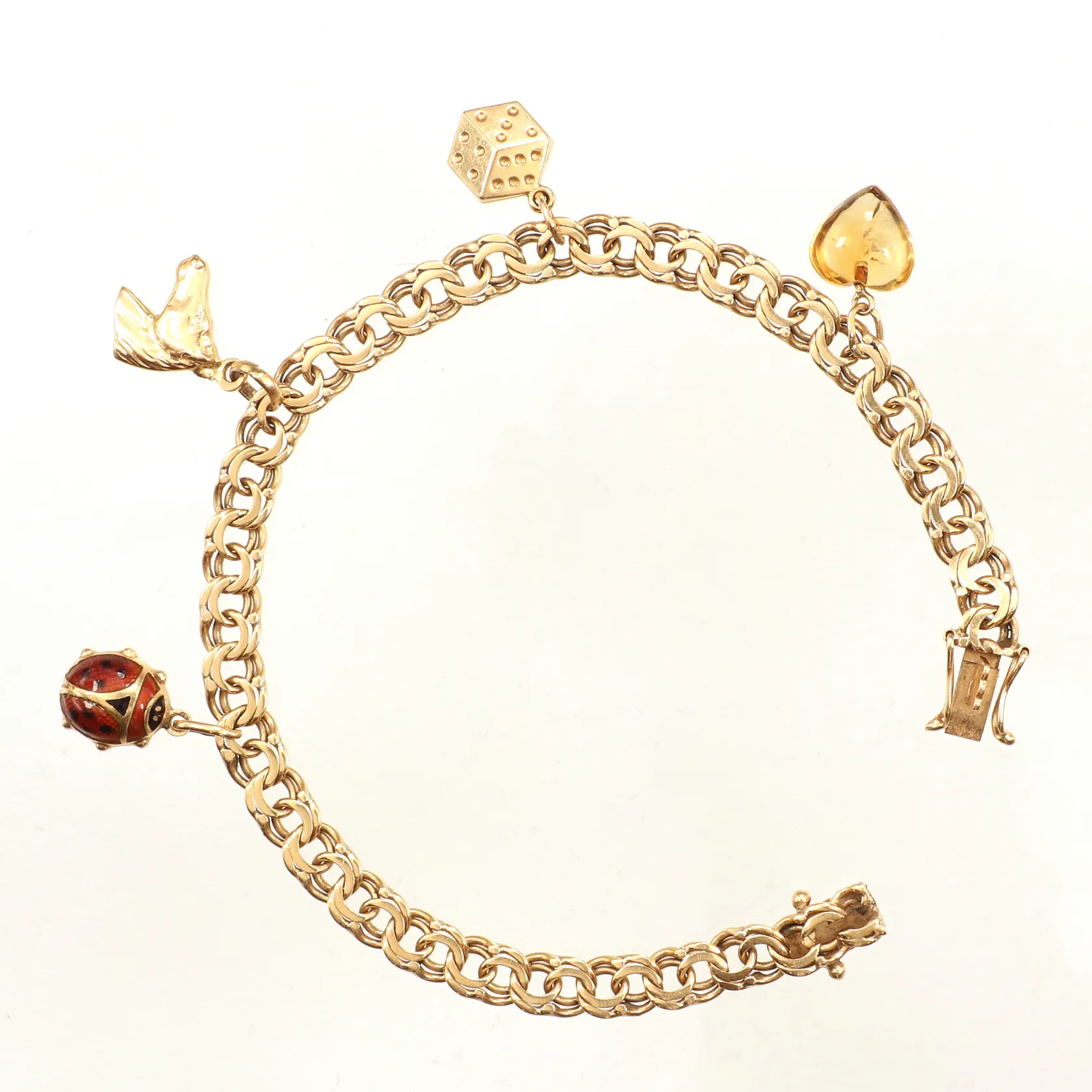 Armband bismarck, längd 19cm, bredd 5,7mm, fyra berlocker varva en i bärnsten, 18K Vikt: 14,7 g.