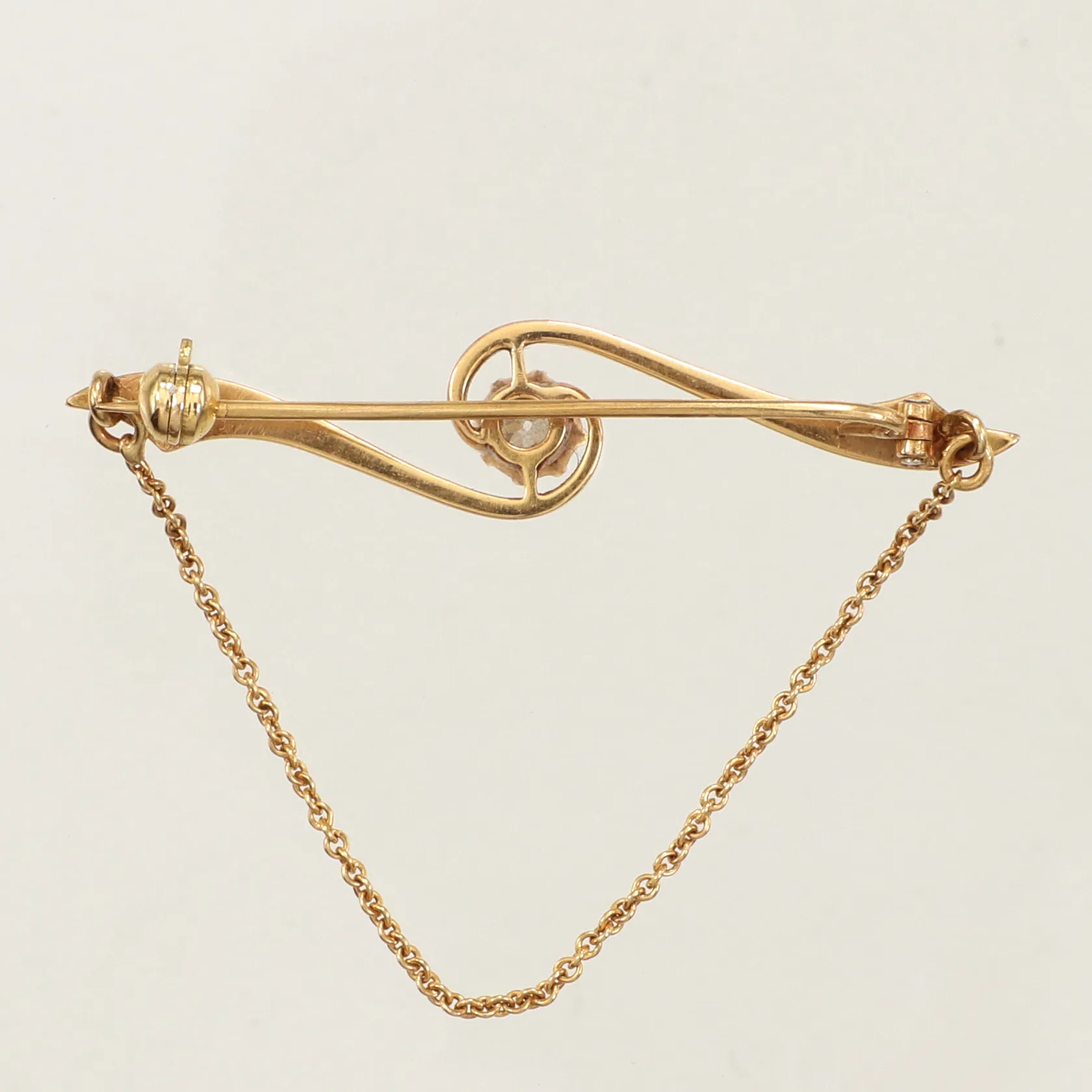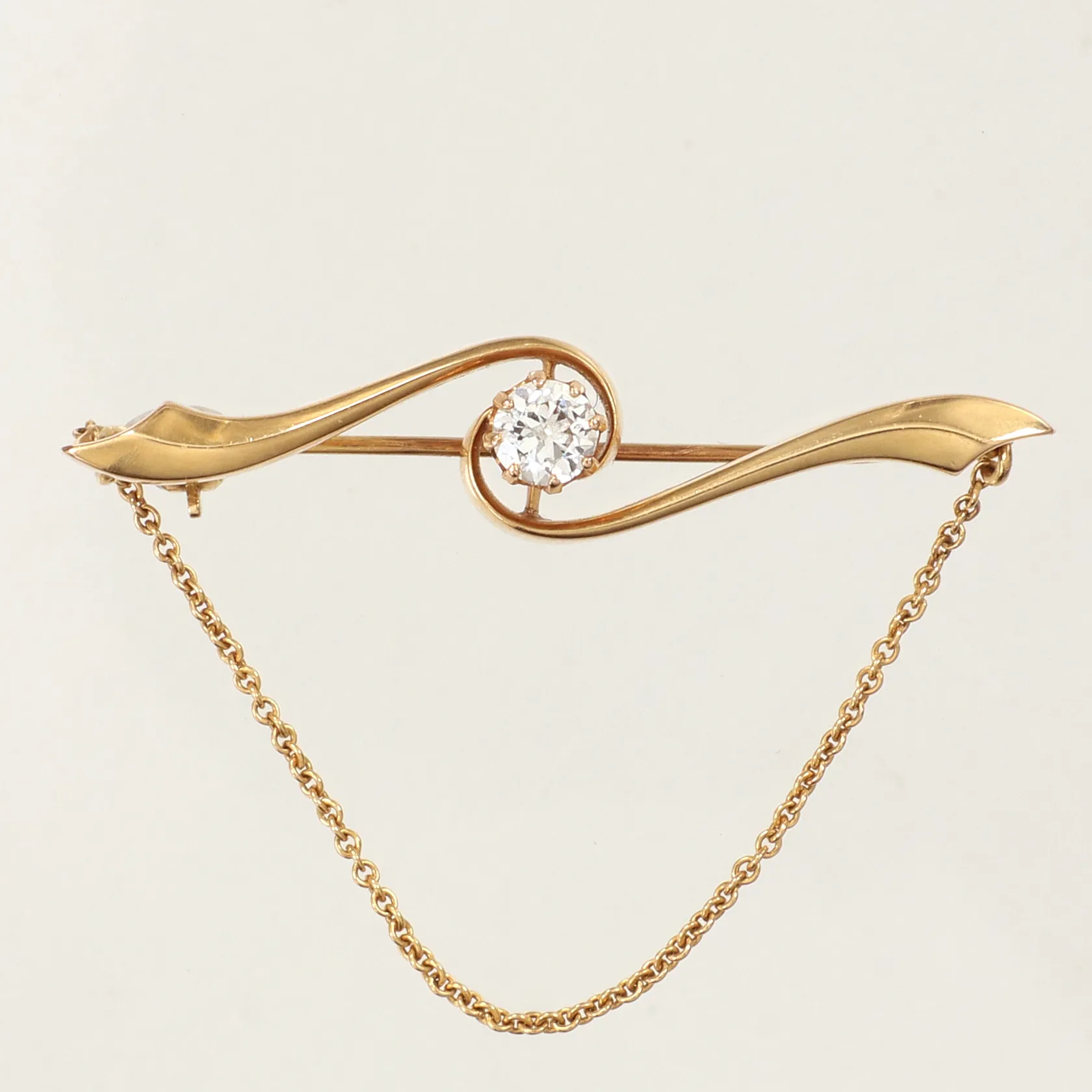 Brosch med gammalslipad diamant ca 0,30ct, längd 41mm, bredd 8,5mm, något skev nål, 18K Vikt: 4,4 g.